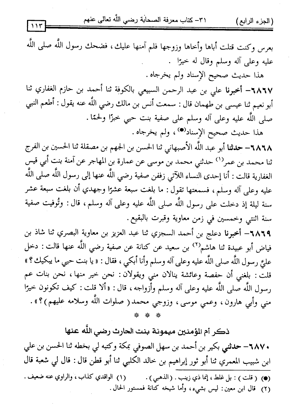 6868 - حَدَّثَنَا أَبُو عَبْدِ اللَّهِ الْأَصْبَهَانِيُّ ، ثنا الْحَسَنُ بْنُ الْجَهْمِ بْنِ مَصْقَلَةَ ، ثنا الْحُسَيْنُ بْنُ الْفَرَجِ ، ثنا مُحَمَّدُ بْنُ عُمَرَ ، حَدَّثَنِي مُحَمَّدُ بْنُ مُوسَى ، عَنْ عُمَارَةَ بْنِ الْمُهَاجِرِ ، عَنْ آمِنَةَ بِنْتِ أَبِي قَيْسٍ الْغِفَارِيَّةِ ، قَالَتْ: أَنَا إِحْدَى النِّسَاءِ اللَّاتِي زَفَفْنَ صَفِيَّةَ ، رَضِيَ اللَّهُ عَنْهَا إِلَى رَسُولِ اللَّهِ صَلَّى اللَّهُ عَلَيْهِ وَسَلَّمَ ، فَسَمِعْتُهَا تَقُولُ: " مَا بَلَغْتُ سَبْعَ عَشَرَةَ ، وَجَهْدِي أَنْ بَلَغْتُ سَبْعَ عَشْرَةَ سَنَةً لَيْلَةً إِذْ دَخَلْتُ عَلَى رَسُولِ اللَّهِ صَلَّى اللَّهُ عَلَيْهِ وَسَلَّمَ " قَالَ: " وَتُوُفِّيَتْ صَفِيَّةُ سَنَةَ اثْنَتَيْنِ وَخَمْسِينَ فِي زَمَنِ مُعَاوِيَةَ وَقُبِرَتْ بِالْبَقِيعِ "