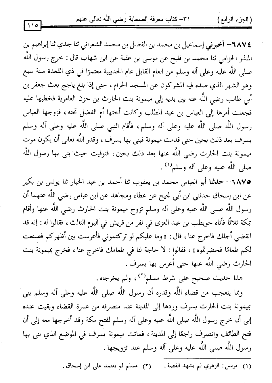 6874 - أَخْبَرَنِي إِسْمَاعِيلُ بْنُ مُحَمَّدِ بْنِ الْفَضْلِ بْنِ مُحَمَّدٍ الشَّعْرَانِيُّ ، ثنا جَدِّي ، ثنا إِبْرَاهِيمُ بْنُ الْمُنْذِرِ الْحِزَامِيُّ ، ثنا مُحَمَّدُ بْنُ فُلَيْحٍ ، عَنْ مُوسَى بْنِ عُقْبَةَ ، عَنِ ابْنِ شِهَابٍ ، قَالَ: " خَرَجَ رَسُولُ اللَّهِ صَلَّى اللَّهُ عَلَيْهِ وَسَلَّمَ مِنَ الْعَامِ الْقَابِلِ عَامَ الْحُدَيْبِيَةِ مُعْتَمِرًا فِي ذِي الْقَعْدَةَ سَنَةَ سَبْعٍ وَهُوَ الشَّهْرُ الَّذِي صَدَّهُ فِيهِ الْمُشْرِكُونَ عَنِ الْمَسْجِدِ الْحَرَامِ ، حَتَّى إِذَا بَلَغَ يَأْجَجَ بَعَثَ جَعْفَرَ بْنَ أَبِي طَالِبٍ رَضِيَ اللَّهُ عَنْهُ بَيْنَ يَدَيْهِ إِلَى مَيْمُونَةَ بِنْتِ الْحَارِثِ بْنِ حَزْنٍ الْعَامِرِيَّةِ ، فَخَطَبَهَا عَلَيْهِ فَجَعَلَتْ أَمْرَهَا إِلَى الْعَبَّاسِ بْنِ عَبْدِ الْمُطَّلِبِ وَكَانَتْ أُخْتُهَا أُمَّ الْفَضْلِ تَحْتَهُ فَزَوَّجَهَا الْعَبَّاسُ رَسُولَ اللَّهِ صَلَّى اللَّهُ عَلَيْهِ وَسَلَّمَ ، فَأَقَامَ النَّبِيُّ صَلَّى اللَّهُ عَلَيْهِ وَسَلَّمَ بِسَرِفٍ بَعْدَ ذَلِكَ بِحِينٍ ، حَتَّى قَدِمَتْ مَيْمُونَةُ فَبَنَى بِهَا بِسَرِفٍ وَقَدَّرَ اللَّهُ تَعَالَى أَنْ يَكُونَ مَوْتُ مَيْمُونَةَ بِنْتِ الْحَارِثِ رَضِيَ اللَّهُ عَنْهَا بَعْدَ ذَلِكَ بِحِينٍ ، فَتُوُفِّيَتْ حَيْثُ بَنَى بِهَا رَسُولُ اللَّهِ صَلَّى اللَّهُ عَلَيْهِ وَسَلَّمَ "