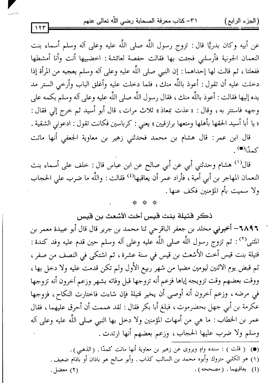 6896 - أَخْبَرَنِي مَخْلَدُ بْنُ جَعْفَرٍ الْبَاقَرْحِيُّ ، ثَنَا مُحَمَّدُ بْنُ جَرِيرٍ ، قَالَ: قَالَ أَبُوعُبَيْدَةَ مَعْمَرُ بْنُ الْمُثَنَّى: " ثُمَّ تَزَوَّجَ رَسُولُ اللَّهِ صَلَّى اللَّهُ عَلَيْهِ وَسَلَّمَ حِينَ قَدِمَ عَلَيْهِ وَفْدُ كِنْدَةَ قُتَيْلَةَ بِنْتَ قَيْسٍ أُخْتَ الْأَشْعَثِ بْنِ قَيْسٍ فِي سَنَةِ عَشْرَةٍ ، ثُمَّ اشْتَكَى فِي النِّصْفِ مِنْ صَفَرٍ ، ثُمَّ قُبِضَ يَوْمَ الِاثْنَيْنِ لِيَوْمَيْنِ مَضَيَا مِنْ شَهْرِ رَبِيعٍ الْأَوَّلِ ، وَلَمْ تَكُنٍ قَدِمَتْ عَلَيْهِ وَلَا دَخَلَ بِهَا " وَوَقَّتَ بَعْضُهُمْ وَقْتَ تَزْوِيجِهِ إِيَّاهَا ، فَزَعَمَ أَنَّهُ تَزَوَّجَهَا قَبْلَ وَفَاتِهِ بِشَهْرٍ ، وَزَعَمَ آخَرُونَ أَنَّهُ تَزَوَّجَهَا فِي مَرَضِهِ ، وَزَعَمَ آخَرُونَ أَنَّهُ أَوْصَى أَنْ يُخَيِّرَ قُتَيْلَةَ فَإِنْ شَاءَتْ ، فَاخْتَارَتِ النِّكَاحَ ، فَزُوِّجَهَا عِكْرِمَةُ بْنُ أَبِي جَهْلٍ بِحَضْرَمَوْتَ ، فَبَلَغَ أَبَا بَكْرٍ فَقَالَ: لَقَدْ هَمَمْتُ أَنْ أُحَرِّقَ عَلَيْهِمَا ، فَقَالَ عُمَرُ بْنُ الْخَطَّابِ: مَا هِيَ مِنْ أُمَّهَاتِ الْمُؤْمِنِينَ وَلَا دَخَلَ بِهَا النَّبِيُّ صَلَّى اللَّهُ عَلَيْهِ وَسَلَّمَ وَلَا ضَرَبَ عَلَيْهَا الْحِجَابَ ، وَزَعَمَ بَعْضُهُمْ أَنَّهَا ارْتَدَّتْ