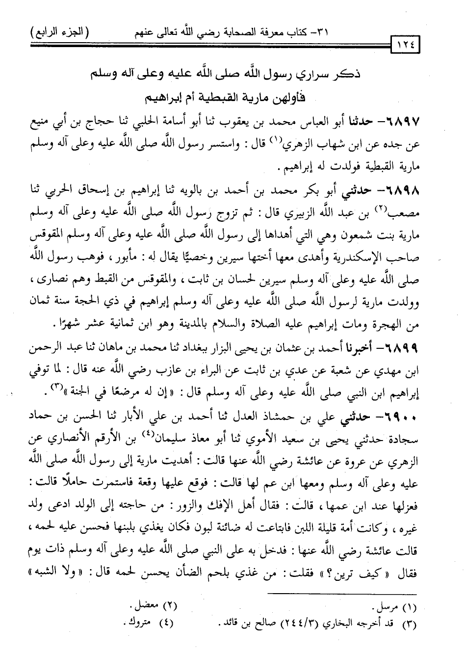 6898 - حَدَّثَنِي أَبُو بَكْرٍ مُحَمَّدُ بْنُ أَحْمَدَ بْنِ بَالَوَيْهِ ، ثَنَا إِبْرَاهِيمُ بْنُ إِسْحَاقَ الْحَرْبِيُّ ، ثَنَا مُصْعَبُ بْنُ عَبْدِ اللَّهِ الزُّبَيْرِيُّ ، قَالَ: " ثُمَّ تَزَوَّجَ رَسُولُ اللَّهِ صَلَّى اللَّهُ عَلَيْهِ وَسَلَّمَ مَارِيَةَ بِنْتَ شَمْعُونَ وَهِيَ الَّتِي أَهْدَاهَا إِلَى رَسُولِ اللَّهِ صَلَّى اللَّهُ عَلَيْهِ وَسَلَّمَ الْمُقَوْقِسُ صَاحِبُ الْإِسْكَنْدَرِيَّةِ ، وَأَهْدَى مَعَهَا أُخْتَهَا سِيرِينَ وَخَصِيًّا يُقَالُ لَهُ: مَابُورُ ، فَوَهَبَ رَسُولُ اللَّهِ صَلَّى اللَّهُ عَلَيْهِ وَسَلَّمَ سِيرِينَ لِحَسَّانَ بْنِ ثَابِتٍ ، وَالْمُقَوْقِسُ مِنَ الْقِبْطِ وَهُمْ نَصَارَى ، وَوَلَدَتْ مَارِيَةُ لِرَسُولِ اللَّهِ صَلَّى اللَّهُ عَلَيْهِ وَسَلَّمَ إِبْرَاهِيمَ فِي ذِي الْحِجَّةِ سَنَةَ ثَمَانٍ مِنَ الْهِجْرَةِ ، وَمَاتَ إِبْرَاهِيمُ عَلَيْهِ الصَّلَاةُ وَالسَّلَامُ بِالْمَدِينَةِ وَهُوَ ابْنُ ثَمَانِيَةَ عَشَرَ شَهْرًا "