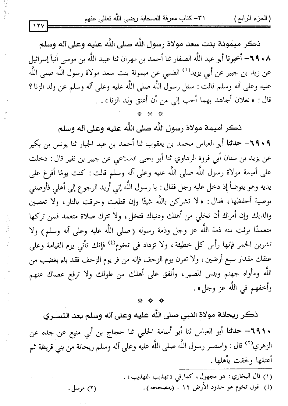 6909 - حَدَّثَنَا أَبُو الْعَبَّاسِ مُحَمَّدُ بْنُ يَعْقُوبَ ، ثَنَا أَحْمَدُ بْنُ عَبْدِ الْجَبَّارِ ، ثَنَا يُونُسُ بْنُ بُكَيْرٍ ، عَنْ يَزِيدَ بْنِ سِنَانٍ أَبِي فَرْوَةَ الرَّهَاوِيِّ ، ثَنَا أَبُو يَحْيَى الْكَلَاعِيُّ ، عَنْ جُبَيْرِ بْنِ نُفَيْرٍ ، قَالَ: دَخَلْتُ عَلَى أُمَيْمَةَ ، مَوْلَاةِ رَسُولِ اللَّهِ صَلَّى اللَّهُ عَلَيْهِ وَسَلَّمَ قَالَتْ: كُنْتُ يَوْمًا أُفْرِغُ عَلَى يَدَيْهِ وَهُوَ يَتَوَضَّأُ إِذْ دَخَلَ عَلَيْهِ رَجُلٌ فَقَالَ: يَا رَسُولَ اللَّهِ إِنِّي أُرِيدُ الرُّجُوعَ إِلَى أَهْلِي فَأَوْصِنِي بِوَصِيَّةٍ أَحْفَظْهَا ، فَقَالَ: " لَا تُشْرِكَنَّ بِاللَّهِ شَيْئًا وَإِنْ قُطِّعْتَ وَحُرِّقْتَ بِالنَّارِ ، وَلَا تَعْصِيَنَّ وَالِدَيْكَ وَإِنْ أَمَرَاكَ أَنْ تُخَلِّيَ مِنْ أَهْلِكَ وَدُنْيَاكَ فَتَخَلَّ ، وَلَا تَتْرُكْ صَلَاةً مُتَعَمِّدًا فَمَنْ تَرَكَهَا مُتَعَمِّدًا بَرِئَتْ مِنْهُ ذِمَّةُ اللَّهِ عَزَّ وَجَلَّ وَذِمَّةُ رَسُولِهِ صَلَّى اللَّهُ عَلَيْهِ وَسَلَّمَ ، وَلَا تَشْرَبَنَّ الْخَمْرَ فَإِنَّهَا رَأْسُ كُلِّ خَطِيئَةٍ ، وَلَا تَزْدَدْ فِي تُخُومٍ فَإِنَّكَ تَأْتِي يَوْمَ الْقِيَامَةِ وَعَلَى عُنُقِكَ مِقْدَارُ سَبْعِ أَرَضِينَ ، وَلَا تَفِرَّنَّ يَوْمَ الزَّحْفِ فَإِنَّهُ مَنْ فَرَّ يَوْمَ الزَّحْفِ فَقَدْ بَاءَ بِغَضَبٍ مِنَ اللَّهِ وَمَأْوَاهُ جَهَنَّمُ وَبِئْسَ الْمَصِيرُ ، وَأَنْفِقْ عَلَى أَهْلِكَ مِنْ طَوْلِكَ وَلَا تَرْفَعْ عَصَاكَ عَنْهُمْ وَأَخِفْهُمْ فِي اللَّهِ عَزَّ وَجَلَّ "