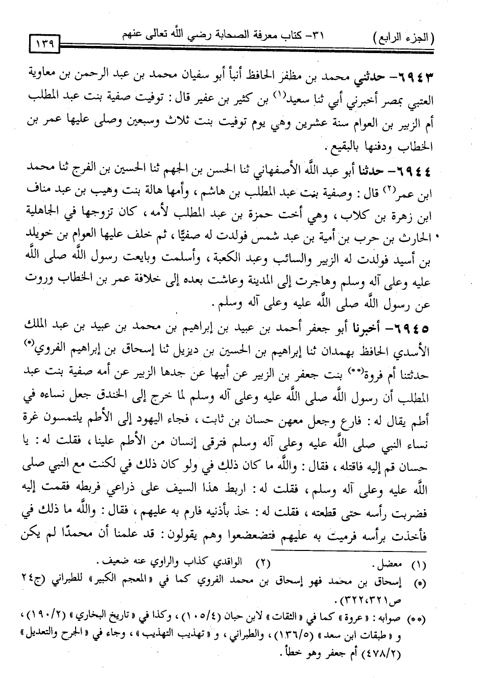 6944 - حَدَّثَنَا أَبُو عَبْدِ اللَّهِ الْأَصْفَهَانِيُّ * ، ثَنَا الْحَسَنُ بْنُ الْجَهْمِ ، ثَنَا الْحُسَيْنُ بْنُ الْفَرَجِ ، ثَنَا مُحَمَّدُ بْنُ عُمَرَ ، قَالَ: " وَصَفِيَّةُ بِنْتُ عَبْدِ الْمُطَّلِبِ بْنِ هَاشِمٍ وَأُمُّهَا هَالَةُ بِنْتُ وُهَيْبِ بْنِ عَبْدِ مَنَافِ بْنِ زُهْرَةَ بْنِ كِلَابٍ ، وَهِيَ أُخْتُ حَمْزَةَ بْنِ عَبْدِ الْمُطَّلِبِ لِأُمِّهِ ، كَانَ تَزَوَّجَهَا فِي الْجَاهِلِيَّةِ الْحَارِثُ بْنُ حَرْبِ بْنِ أُمَيَّةَ بْنِ عَبْدِ شَمْسٍ ، فَوَلَدَتْ لَهُ صَفِيًّا ، ثُمَّ خَلَفَ عَلَيْهَا الْعَوَّامُ بْنُ خُوَيْلِدِ بْنِ أُسَيْدٍ ، فَوَلَدَتْ لَهُ الزُّبَيْرَ وَالسَّائِبَ وَعَبْدَ الْكَعْبَةِ ، وَأَسْلَمَتْ وَبَايَعَتْ رَسُولَ اللَّهِ صَلَّى اللَّهُ عَلَيْهِ وَسَلَّمَ وَهَاجَرَتْ إِلَى الْمَدِينَةِ ، وَعَاشَتْ بَعْدَهُ إِلَى خِلَافَةِ عُمَرَ بْنِ الْخَطَّابِ ، وَرَوَتْ عَنْ رَسُولِ اللَّهِ صَلَّى اللَّهُ عَلَيْهِ وَسَلَّمَ "
