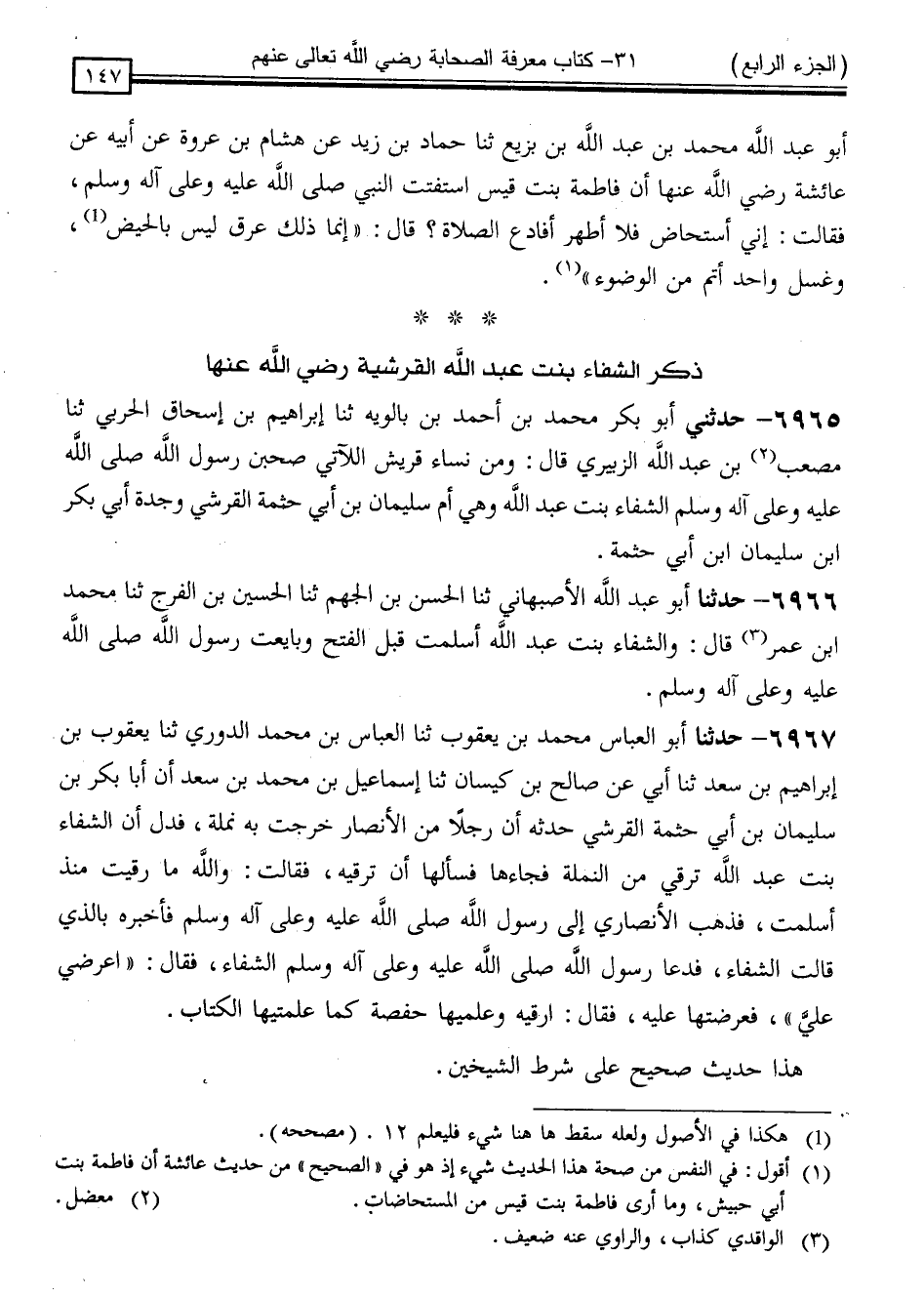 6965 - حَدَّثَنِي أَبُو بَكْرٍ مُحَمَّدُ بْنُ أَحْمَدَ بْنِ بَالَوَيْهِ ، ثَنَا إِبْرَاهِيمُ بْنُ إِسْحَاقَ الْحَرْبِيُّ ، ثَنَا مُصْعَبُ بْنُ عَبْدِ اللَّهِ الزُّبَيْرِيُّ ، قَالَ: " وَمِنْ نِسَاءِ قُرَيْشٍ اللَّاتِي صَحِبْنَ رَسُولَ اللَّهِ صَلَّى اللَّهُ عَلَيْهِ وَسَلَّمَ الشِّفَاءُ بِنْتُ عَبْدِ اللَّهِ وَهِيَ أُمُّ سُلَيْمَانَ بْنِ أَبِي حَثْمَةَ الْقُرَشِيِّ وَجَدَّةُ أَبِي بَكْرِ بْنِ سُلَيْمَانَ بْنِ أَبِي حَثْمَةَ "