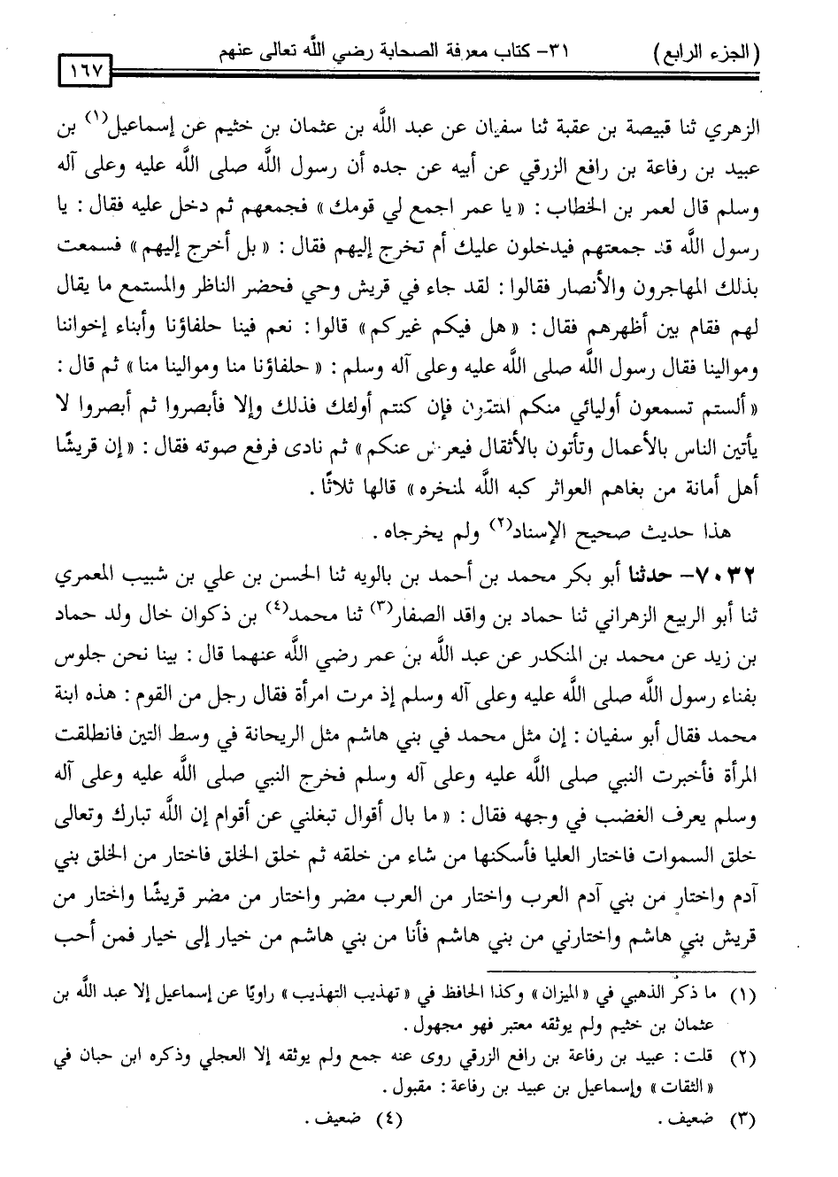 7032 - حَدَّثَنَا أَبُو بَكْرٍ مُحَمَّدُ بْنُ أَحْمَدَ بْنِ بَالَوَيْهِ ، ثَنَا الْحَسَنُ بْنُ عَلِيِّ بْنِ شَبِيبٍ الْمَعْمَرِيُّ ، ثَنَا أَبُو الرَّبِيعِ الزَّهْرَانِيُّ ، ثَنَا حَمَّادُ بْنُ وَاقِدٍ الصَّفَّارُ ، ثَنَا مُحَمَّدُ بْنُ ذَكْوَانَ ، خَالُ وَلَدِ حَمَّادِ بْنِ زَيْدٍ ، عَنْ مُحَمَّدِ بْنِ الْمُنْكَدِرِ ، عَنْ عَبْدِ اللَّهِ بْنِ عُمَرَ ، رَضِيَ اللَّهُ عَنْهُمَا قَالَ: بَيْنَا نَحْنُ جُلُوسٌ بِفِنَاءِ رَسُولِ اللَّهِ صَلَّى اللَّهُ عَلَيْهِ وَسَلَّمَ إِذْ مَرَّتِ امْرَأَةٌ ، فَقَالَ رَجُلٌ مِنَ الْقَوْمِ: هَذِهِ ابْنَةُ مُحَمَّدٍ ، فَقَالَ أَبُو سُفْيَانَ: إِنَّ مَثَلَ مُحَمَّدٍ فِي بَنِي هَاشِمٍ مَثَلُ الرَّيْحَانَةِ فِي وَسَطِ التِّينِ ، فَانْطَلَقَتِ الْمَرْأَةُ فَأَخْبَرَتِ النَّبِيَّ صَلَّى اللَّهُ عَلَيْهِ وَسَلَّمَ ، فَخَرَجَ النَّبِيُّ صَلَّى اللَّهُ عَلَيْهِ وَسَلَّمَ يُعْرَفُ الْغَضَبُ فِي وَجْهِهِ فَقَالَ: " مَا بَالُ أَقْوَالٍ تَبْلُغُنِي عَنْ أَقْوَامٍ إِنَّ اللَّهَ تَبَارَكَ وَتَعَالَى خَلَقَ السَّمَاوَاتِ ، فَاخْتَارَ الْعُلْيَا فَأَسْكَنْهَا مَنْ شَاءَ مِنْ خَلْقِهِ ، ثُمَّ خَلَقَ الْخَلْقَ فَاخْتَارَ مِنَ الْخَلْقِ بَنِي آدَمَ وَاخْتَارَ مِنْ بَنِي آدَمَ الْعَرَبَ ، وَاخْتَارَ مِنَ الْعَرَبِ مُضَرَ ، وَاخْتَارَ مِنْ مُضَرَ قُرَيْشًا ، وَاخْتَارَ مِنْ قُرَيْشٍ بَنِي هَاشِمٍ ، وَاخْتَارَنِي مِنْ بَنِي هَاشِمٍ ، فَأَنَا مِنْ بَنِي هَاشِمٍ مِنْ خِيَارٍ إِلَى خِيَارٍ ، فَمَنْ أَحَبَّ -[168]- الْعَرَبَ فَبِحُبِّي أَحَبَّهُمْ ، وَمَنْ أَبْغَضَ الْعَرَبَ فَبِبُغْضِي أَبْغَضَهُمْ " وَقَدْ قِيلَ فِي هَذَا الْإِسْنَادِ عَنْ مُحَمَّدِ بْنِ ذَكْوَانَ ، عَنْ عَمْرِو بْنِ دِينَارٍ ، عَنْ عَبْدِ اللَّهِ بْنِ عُمَرَ ،