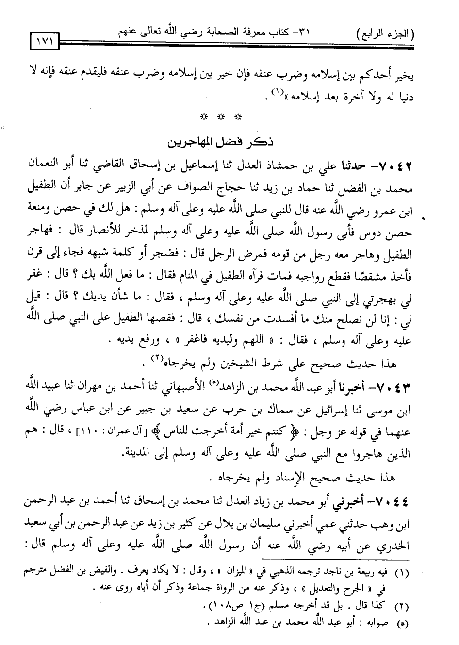 7042 - حَدَّثَنَا عَلِيُّ بْنُ حَمْشَاذَ الْعَدْلُ ، ثَنَا إِسْمَاعِيلُ بْنُ إِسْحَاقَ الْقَاضِي ، ثَنَا أَبُو النُّعْمَانِ مُحَمَّدُ بْنُ الْفَضْلِ ، ثَنَا حَمَّادُ بْنُ زَيْدٍ ، ثَنَا حَجَّاجٌ الصَّوَّافُ ، عَنْ أَبِي الزُّبَيْرِ ، عَنْ جَابِرٍ ، أَنَّ الطُّفَيْلَ بْنَ عَمْرٍو رَضِيَ اللَّهُ عَنْهُ قَالَ لِلنَّبِيِّ صَلَّى اللَّهُ عَلَيْهِ وَسَلَّمَ: هَلْ لَكَ فِي حِصْنٍ وَمَنَعَةِ حِصْنِ دَوْسٍ ، فَأَتَى رَسُولُ اللَّهِ صَلَّى اللَّهُ عَلَيْهِ وَسَلَّمَ لِمِذْخَرٍ لِلْأَنْصَارِ قَالَ: فَهَاجَرَ الطُّفَيْلُ وَهَاجَرَ مَعَهُ رَجُلٌ مِنْ قَوْمِهِ فَمَرِضَ الرَّجُلُ - قَالَ: فَضَجِرَ أَوْ كَلِمَةً شَبَهَهُ - فَجَاءَ إِلَى قَرْنٍ ، فَأَخَذَ مِشْقَصًا ، فَقَطَعَ رَوَاجِبَهُ فَمَاتَ ، فَرَآهُ الطُّفَيْلُ فِي الْمَنَامِ ، فَقَالَ: مَا فَعَلَ اللَّهُ بِكَ ؟ قَالَ: غَفَرَ لِي بِهِجْرَتِي إِلَى النَّبِيِّ صَلَّى اللَّهُ عَلَيْهِ وَسَلَّمَ فَقَالَ: مَا شَأْنُ يَدَيْكَ ؟ قَالَ: قِيلَ لِي: إِنَّا لَنْ نُصْلِحَ مِنْكَ مَا أَفْسَدْتَ مِنْ نَفْسِكَ ، قَالَ: فَقَصَّهَا الطُّفَيْلُ عَلَى النَّبِيِّ صَلَّى اللَّهُ عَلَيْهِ وَسَلَّمَ ، فَقَالَ: " اللَّهُمَّ وَلِيَدَيْهِ فَاغْفِرْ " وَرَفَعَ يَدَيْهِ