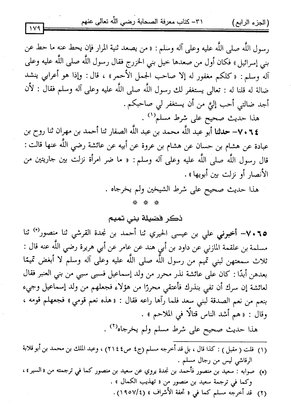 7065 - أَخْبَرَنِي عَلِيُّ بْنُ عِيسَى الْحِيرِيُّ ، ثَنَا أَحْمَدُ بْنُ نَجْدَةَ الْقُرَشِيُّ ، ثَنَا مَنْصُورٌ ، ثَنَا مَسْلَمَةُ بْنُ عَلْقَمَةَ الْمَازِنِيُّ ، عَنْ دَاودَ بْنِ أَبِي هِنْدٍ ، عَنْ عَامِرٍ ، عَنْ أَبِي هُرَيْرَةَ ، رَضِيَ اللَّهُ عَنْهُ قَالَ: " ثَلَاثٌ سَمِعْتُهُنَّ لِبَنِي تَمِيمٍ مِنْ رَسُولِ اللَّهِ صَلَّى اللَّهُ عَلَيْهِ وَسَلَّمَ لَا أَبْغَضُ تَمِيمًا بَعْدَهُنَّ أَبَدًا . كَانَ عَلَى عَائِشَةَ نَذْرٌ مُحَرَّرٌ مِنْ وَلَدِ إِسْمَاعِيلَ فَسُبِيَ سَبْيٌ مِنْ بَنِي الْعَنْبَرِ فَقَالَ لِعَائِشَةَ: إِنْ سَرَّكِ أَنْ تَفِيَ بِنَذْرِكَ فَأَعْتِقِي مُحَرَّرًا مِنْ هَؤُلَاءِ فَجَعَلَهُمْ مِنْ وَلَدِ إِسْمَاعِيلَ وَجِيءَ بِنَعَمٍ مِنْ نَعَمِ الصَّدَقَةِ لِبَنِي سَعْدٍ فَلَمَّا رَآهَا رَاعَهُ فَقَالَ: هَذِهِ ، نَعَمُ قَوْمِي فَجَعَلَهُمْ قَوْمَهُ ، وَقَالَ: هُمْ أَشَدُّ النَّاسِ قِتَالًا فِي الْمَلَاحِمِ "