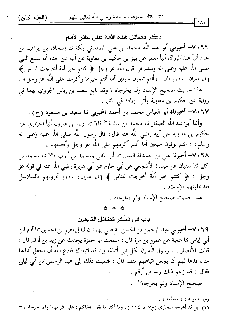 7067 - أَخْبَرَنَاهُ أَبُو الْعَبَّاسِ مُحَمَّدُ بْنُ أَحْمَدَ الْمَحْبُوبِيُّ ، ثَنَا سَعِيدُ بْنُ مَسْعُودٍ ، ح وَأَنْبَأَ أَبُو عَبْدِ اللَّهِ الصَّفَّارُ ، ثَنَا مُحَمَّدُ بْنُ سَلَمَةَ ، قَالَا: ثَنَا يَزِيدُ بْنُ هَارُونَ ، أَنْبَأَ الْجُرَيْرِيُّ ، عَنْ حَكِيمِ بْنِ مُعَاوِيَةَ ، عَنْ أَبِيهِ رَضِيَ اللَّهُ عَنْهُ ، قَالَ: قَالَ رَسُولُ اللَّهِ صَلَّى اللَّهُ عَلَيْهِ وَسَلَّمَ: " أَنْتُمْ تُوفُونَ سَبْعِينَ أُمَّةً أَنْتُمْ أَكْرَمُهُمْ عَلَى اللَّهِ عَزَّ وَجَلَّ وَأَفْضَلُهُمْ "