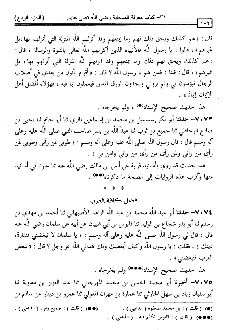 7074 - حَدَّثَنَا أَبُو عَبْدِ اللَّهِ مُحَمَّدُ بْنُ عَبْدِ اللَّهِ الزَّاهِدُ الْأَصْبَهَانِيُّ ، ثَنَا أَحْمَدُ بْنُ مَهْدِيِّ بْنِ رُسْتُمٍ ، ثَنَا أَبُو بَدْرٍ شُجَاعُ بْنُ الْوَلِيدِ ، ثَنَا قَابُوسُ بْنُ أَبِي ظَبْيَانَ ، عَنْ أَبِيهِ ، عَنْ سَلْمَانَ ، رَضِيَ اللَّهُ عَنْهُ قَالَ: قَالَ لِي رَسُولُ اللَّهِ صَلَّى اللَّهُ عَلَيْهِ وَسَلَّمَ: " يَا سَلْمَانُ ، لَا تَبْغَضْنِي فَتُفَارِقَ دِينَكَ " فَقُلْتُ: يَا رَسُولَ اللَّهِ وَكَيْفَ أَبْغَضُكَ وَبِكَ هَدَانِي اللَّهُ عَزَّ وَجَلَّ ؟ قَالَ: " تَبْغَضُ الْعَرَبَ فَتَبْغَضُنِي "