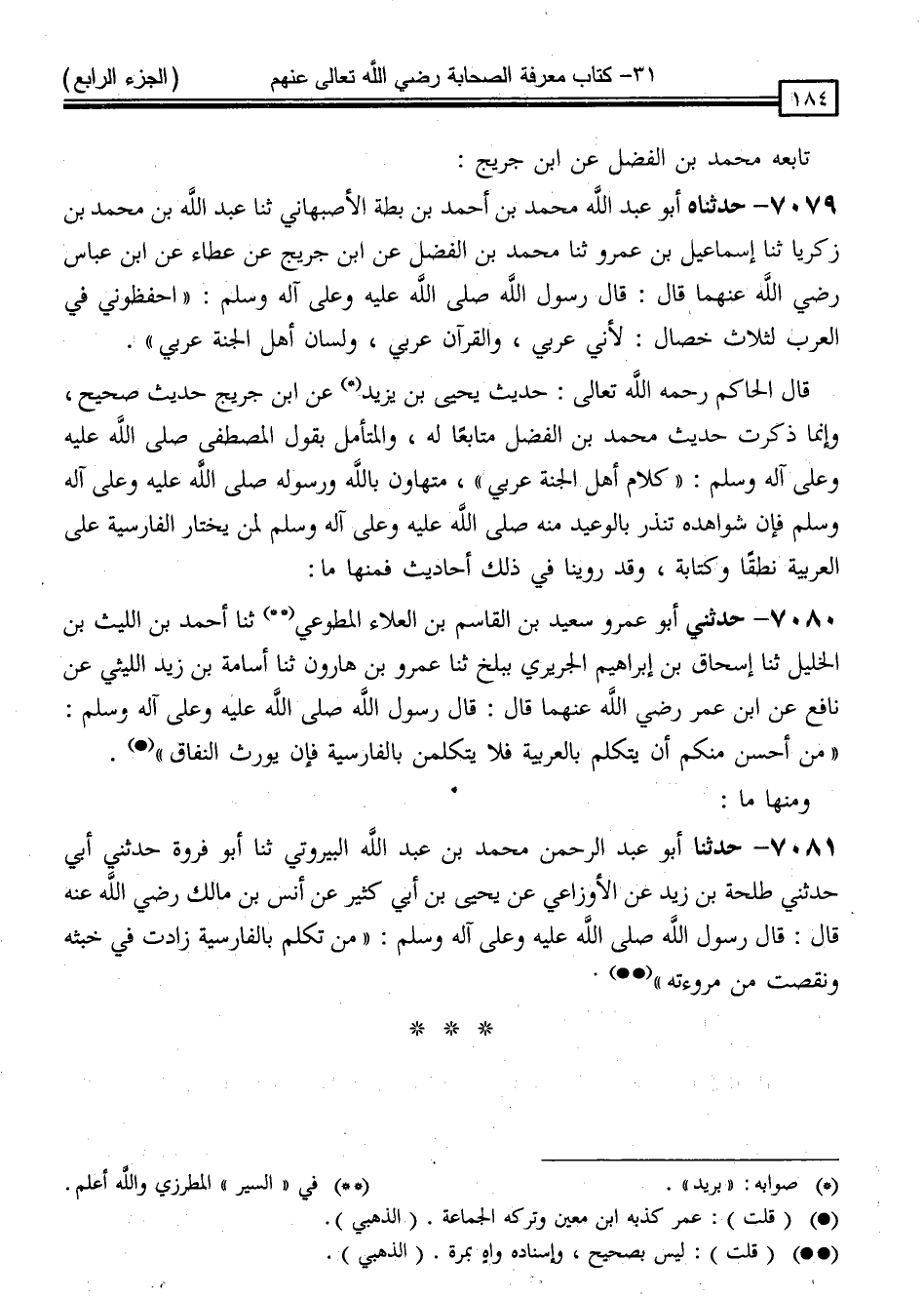 قَالَ الْحَاكِمُ رَحِمَهُ اللَّهُ تَعَالَى: " حَدِيثُ يَحْيَى بْنِ يَزِيدَ ، عَنِ ابْنِ جُرَيْجٍ حَدِيثٌ صَحِيحٌ ، وَإِنَّمَا ذَكَرْتُ حَدِيثَ مُحَمَّدِ بْنِ الْفَضْلِ مُتَابِعًا لَهُ ، وَالْمُتَأَمِّلُ بِقَوْلِ الْمُصْطَفَى صَلَّى اللَّهُ عَلَيْهِ وَسَلَّمَ كَلَامَ أَهْلِ الْجَنَّةِ عَرَبِيُّ مُتَهَاوِنٌ بِاللَّهِ وَرَسُولِهِ صَلَّى اللَّهُ عَلَيْهِ وَسَلَّمَ فَإِنَّ شَوَاهِدَهُ تُنْذِرُ بِالْوَعِيدِ مِنْهُ صَلَّى اللَّهُ عَلَيْهِ وَسَلَّمَ لِمَنْ يخْتَارُ الْفَارِسِيَّةَ عَلَى الْعَرَبِيَّةِ نُطْقًا وَكِتَابَةً ، وَقَدْ رُوِّينَا فِي ذَلِكَ أَحَادِيثَ فَمِنْهَا "