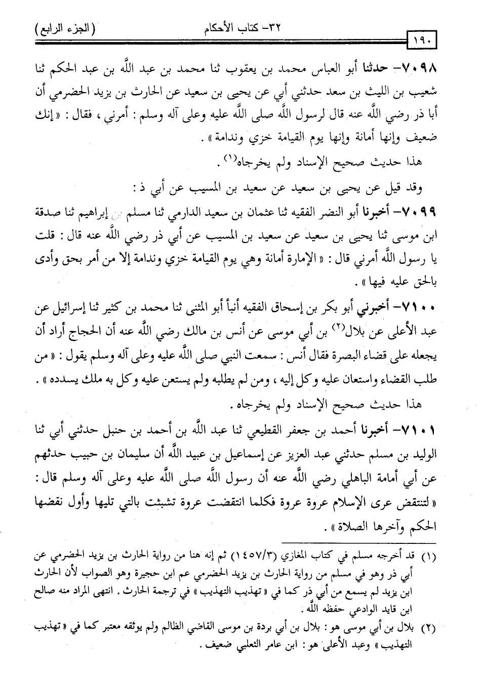 7101 - أَخْبَرَنَا أَحْمَدُ بْنُ جَعْفَرٍ الْقَطِيعِيُّ ، ثَنَا عَبْدُ اللَّهِ بْنُ أَحْمَدَ بْنِ حَنْبَلٍ ، حَدَّثَنِي أَبِي ، ثَنَا الْوَلِيدُ بْنُ مُسْلِمٍ ، حَدَّثَنِي عَبْدُ الْعَزِيزِ ، عَنْ إِسْمَاعِيلَ بْنِ عُبَيْدِ اللَّهِ ، أَنَّ سُلَيْمَانَ بْنَ حَبِيبٍ ، حَدَّثَهُمْ عَنْ أَبِي أُمَامَةَ الْبَاهِلِيِّ ، رَضِيَ اللَّهُ عَنْهُ ، أَنَّ رَسُولَ اللَّهِ صَلَّى اللَّهُ عَلَيْهِ وَسَلَّمَ قَالَ: " لَتُنْتَقَضُ عُرَى الْإِسْلَامِ عُرْوَةٌ عُرْوَةٌ فَكُلَّمَا انْتَقَضَتْ عُرْوَةٌ تَشَبَّثَتْ بِالَّتِي تَلِيهَا وَأَوَّلُ نَقْضِهَا الْحُكْمُ وَآخِرُهَا الصَّلَاةُ " -[191]-