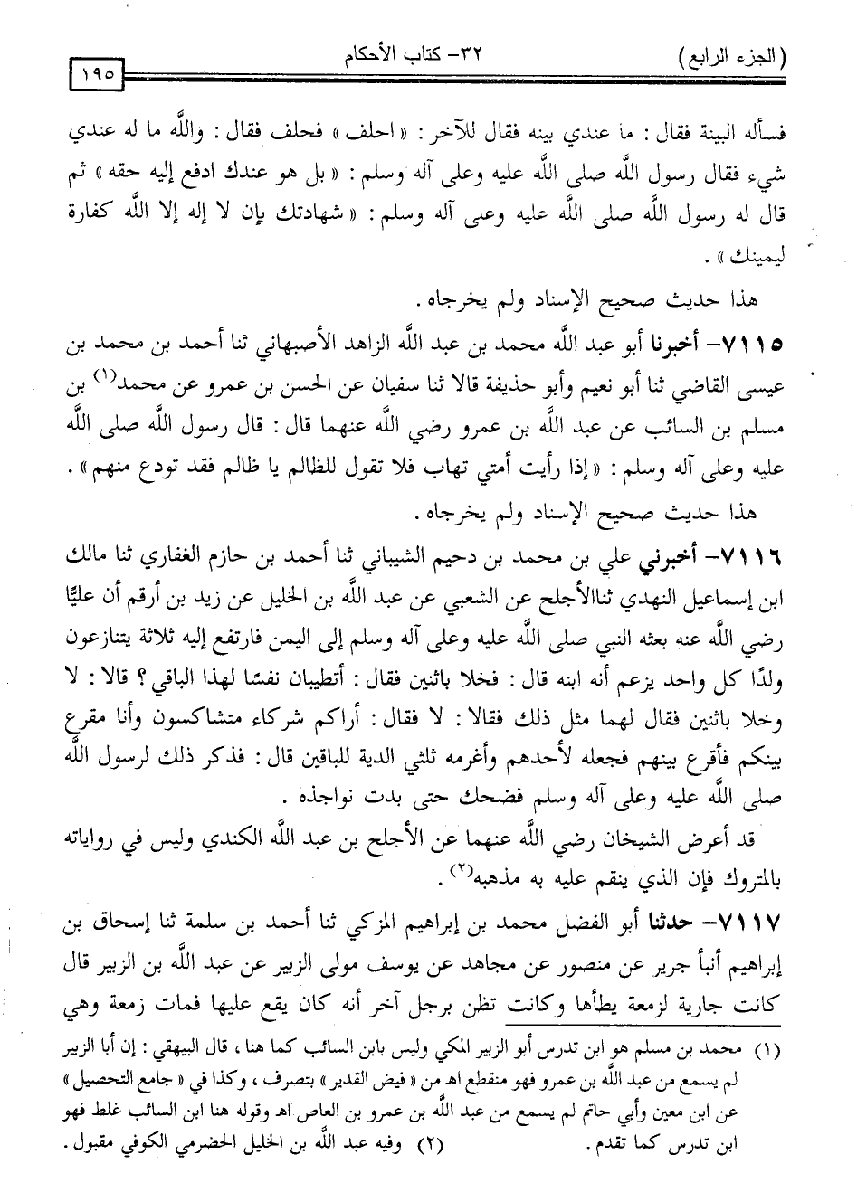 7116 - أَخْبَرَنِي عَلِيُّ بْنُ مُحَمَّدِ * بْنِ دُحَيْمٍ الشَّيْبَانِيُّ ، ثَنَا أَحْمَدُ بْنُ حَازِمٍ الْغِفَارِيُّ ، ثَنَا مَالِكُ بْنُ إِسْمَاعِيلَ النَّهْدِيُّ ، ثَنَا الْأَجْلَحُ ، عَنِ الشَّعْبِيِّ ، عَنْ عَبْدِ اللَّهِ بْنِ الْخَلِيلِ ، عَنْ زَيْدِ بْنِ أَرْقَمَ ، أَنَّ عَلِيًّا ، رَضِيَ اللَّهُ عَنْهُ بَعَثَهُ النَّبِيُّ صَلَّى اللَّهُ عَلَيْهِ وَسَلَّمَ إِلَى الْيَمَنِ فَارْتَفَعَ إِلَيْهِ ثَلَاثَةً يَتَنَازَعُونَ وَلَدًا كُلُّ وَاحِدٍ يَزْعُمُ أَنَّهُ ابْنُهُ قَالَ: فَخَلَا بِاثْنَيْنِ فَقَالَ: " أَتَطِيبَانِ نَفْسًا لِهَذَا الْبَاقِي ؟ " قَالَا: لَا ، وَخَلَا بِاثْنَيْنِ فَقَالَ لَهُمَا مِثْلَ ذَلِكَ . فَقَالَا: لَا ، فَقَالَ: " أَرَاكُمْ شُرَكَاءَ مُتَشَاكِسُونَ وَأَنَا مُقْرِعٌ بَيْنَكُمْ فَأَقْرَعَ بَيْنَهُمْ فَجَعَلَهُ لِأَحَدِهِمْ وَأَغْرَمَهُ ثُلُثَيِ الدِّيَةِ لِلْبَاقِينَ " . قَالَ: " فَذَكَرَ ذَلِكَ لِرَسُولِ اللَّهِ صَلَّى اللَّهُ عَلَيْهِ وَسَلَّمَ فَضَحِكَ حَتَّى بَدَتْ نَوَاجِذُهُ "