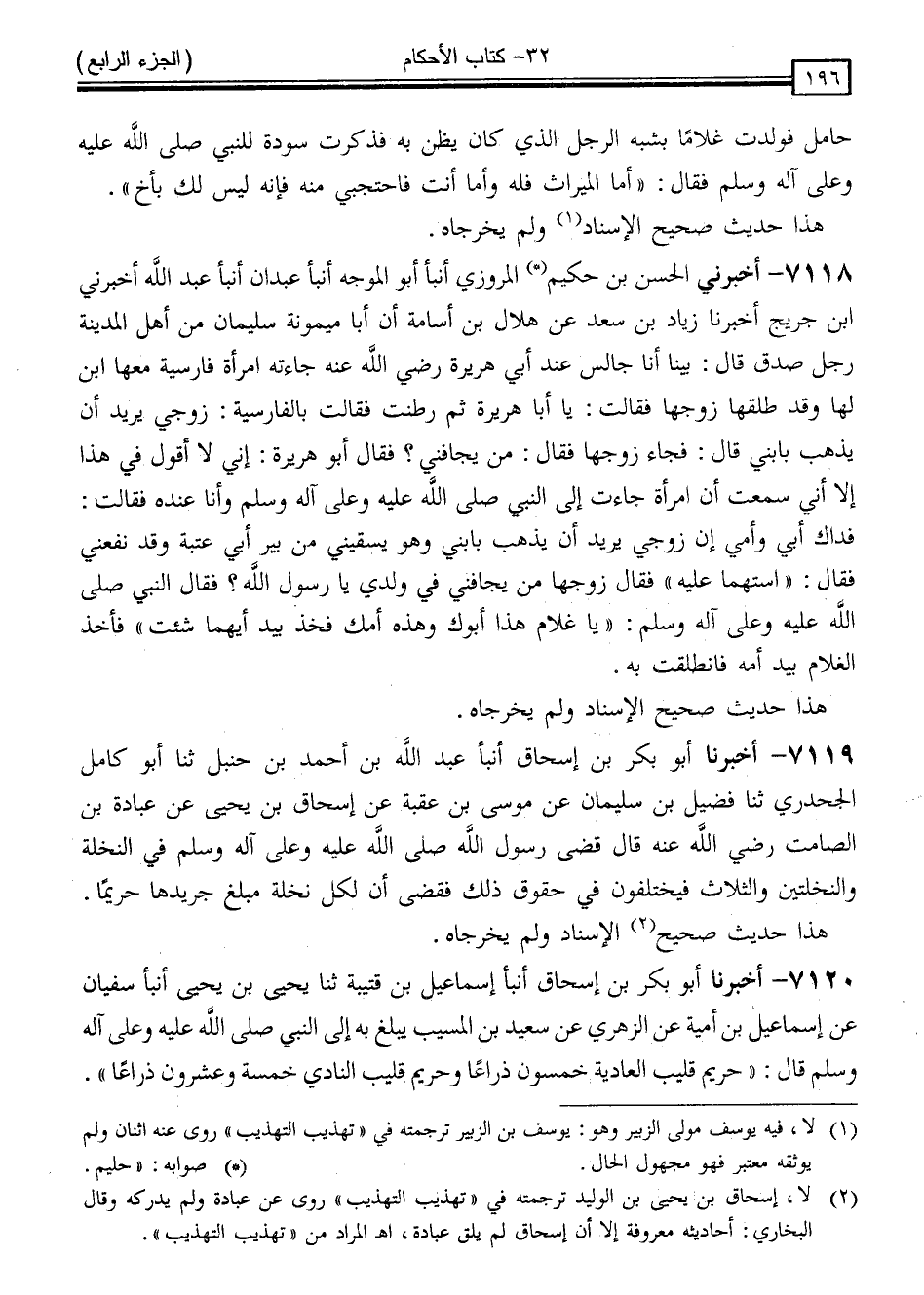 7118 - أَخْبَرَنِي الْحَسَنُ بْنُ حَلِيمٍ الْمَرْوَزِيُّ ، أَنْبَأَ أَبُو الْمُوَجِّهِ ، أَنْبَأَ عَبْدَانُ ، أَنْبَأَ عَبْدُ اللَّهِ ، أَخْبَرَنِي ابْنُ جُرَيْجٍ ، أَخْبَرَنَا زِيَادُ بْنُ سَعْدٍ ، عَنْ هِلَالِ بْنِ أُسَامَةَ ، أَنَّ أَبَا مَيْمُونَةَ سُلَيْمَانَ ، مِنْ أَهْلِ الْمَدِينَةِ رَجُلَ صِدْقٍ قَالَ: بَيْنَا أَنَا جَالِسٌ عِنْدَ أَبِي هُرَيْرَةَ ، رَضِيَ اللَّهُ عَنْهُ جَاءَتْهُ امْرَأَةٌ فَارِسِيَّةٌ مَعَهَا ابْنٌ لَهَا وَقَدْ طَلَّقَهَا زَوْجُهَا فَقَالَتْ: يَا أَبَا هُرَيْرَةَ ثُمَّ رَطَنَتْ فَقَالَتْ بِالْفَارِسِيَّةِ زَوْجِي يُرِيدُ أَنْ يَذْهَبَ بِابْنِي قَالَ: فَجَاءَ زَوْجُهَا فَقَالَ: مَنْ يُجَافِنِي ؟ فَقَالَ أَبُو هُرَيْرَةَ: إِنِّي لَا أَقُولُ فِي هَذَا إِلَّا أَنِّي سَمِعْتُ أَنَّ امْرَأَةً جَاءَتْ إِلَى رَسُولِ اللَّهِ صَلَّى اللَّهُ عَلَيْهِ وَسَلَّمَ وَأَنَا عِنْدَهُ فَقَالَتْ: فِدَاكَ أَبِي وَأُمِّي إِنَّ زَوْجِي يُرِيدُ أَنْ يَذْهَبَ بِابْنِي وَهُوَ يَسْقِيَنِي مِنْ بِئْرِ أَبِي عُتْبَةَ وَقَدْ نَفَعَنِي فَقَالَ: " اسْتَهِمَا عَلَيْهِ " فَقَالَ زَوْجُهَا: مَنْ يُجَافِنِي فِي وَلَدِي يَا رَسُولَ اللَّهِ فَقَالَ النَّبِيُّ صَلَّى اللَّهُ عَلَيْهِ وَسَلَّمَ: " يَا غُلَامُ هَذَا أَبُوكَ وَهَذِهِ أُمُّكَ فَخُذْ بِيَدِ أَيِّهِمَا شِئْتَ " فَأَخَذَ الْغُلَامُ بِيَدِ أُمِّهِ فَانْطَلَقَتْ بِهِ