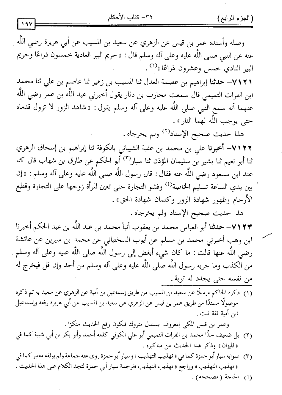 7121 - حَدَّثَنَا إِبْرَاهِيمُ بْنُ عِصْمَةَ الْعَدْلُ ، ثَنَا الْمُسَيِّبُ بْنُ زُهَيْرٍ ، ثَنَا عَاصِمُ بْنُ عَلِيٍّ ، ثَنَا مُحَمَّدُ بْنُ الْفُرَاتِ التَّمِيمِيُّ ، قَالَ: سَمِعْتُ مُحَارِبَ بْنَ دِثَارٍ ، يَقُولُ: أَخْبَرَنِي عَبْدُ اللَّهِ بْنُ عُمَرَ ، رَضِيَ اللَّهُ عَنْهُمَا ، أَنَّهُ سَمِعَ النَّبِيَّ صَلَّى اللَّهُ عَلَيْهِ وَسَلَّمَ يَقُولُ: " شَاهِدُ الزُّورِ لَا تَزُولُ قَدَمَاهُ حَتَّى يُوجِبَ اللَّهُ لَهُمَا النَّارَ "