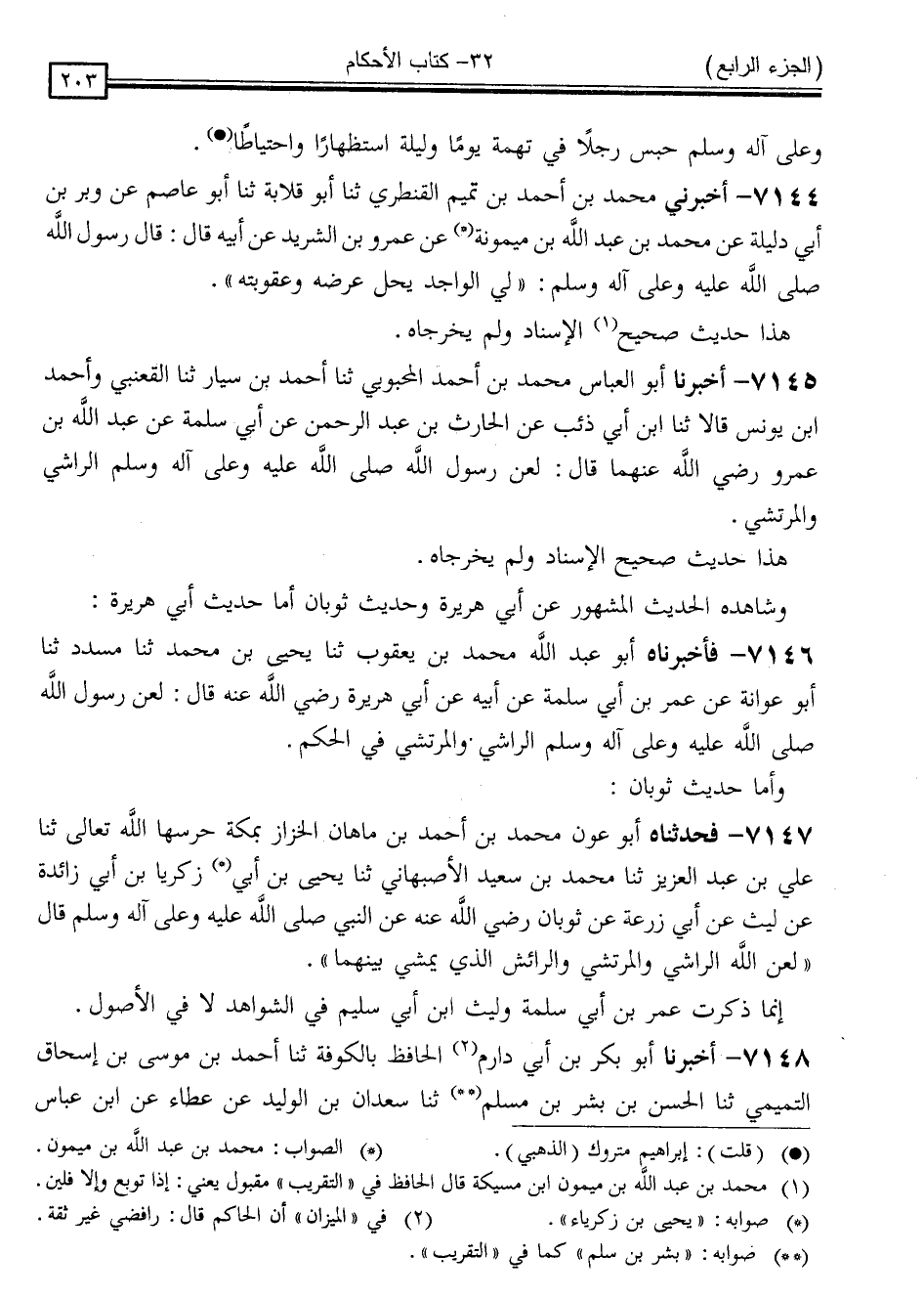 7145 - أَخْبَرَنَا أَبُو الْعَبَّاسِ مُحَمَّدُ بْنُ أَحْمَدَ الْمَحْبُوبِيُّ ، ثَنَا أَحْمَدُ بْنُ سَيَّارٍ ، ثَنَا الْقَعْنَبِيُّ ، وَأَحْمَدُ بْنُ يُونُسَ ، قَالَا: ثَنَا ابْنُ أَبِي ذِئْبٍ ، عَنِ الْحَارِثِ بْنِ عَبْدِ الرَّحْمَنِ ، عَنْ أَبِي سَلَمَةَ ، عَنْ عَبْدِ اللَّهِ بْنِ عَمْرٍو ، رَضِيَ اللَّهُ عَنْهُمَا قَالَ: " لَعَنَ رَسُولُ اللَّهِ صَلَّى اللَّهُ عَلَيْهِ وَسَلَّمَ الرَّاشِيَ وَالْمُرْتَشِيَ "