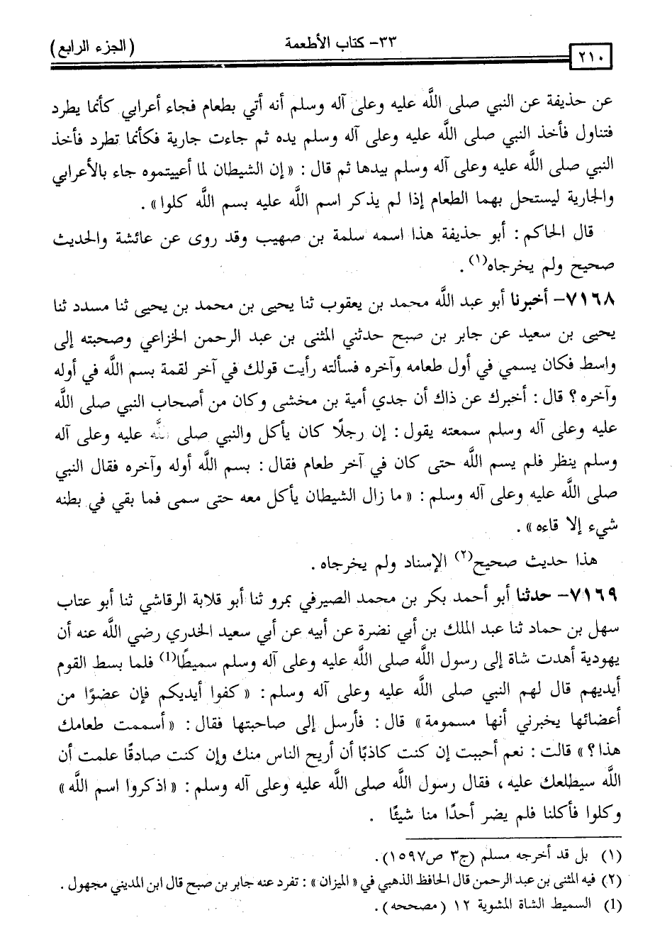 7168 - أَخْبَرَنَا أَبُو عَبْدِ اللَّهِ مُحَمَّدُ بْنُ يَعْقُوبَ ، ثَنَا يَحْيَى بْنُ مُحَمَّدِ بْنِ يَحْيَى ، ثَنَا مُسَدَّدٌ ، ثَنَا يَحْيَى بْنُ سَعِيدٍ ، عَنْ جَابِرِ بْنِ صُبْحٍ ، حَدَّثَنِي الْمُثَنَّى بْنُ عَبْدِ الرَّحْمَنِ الْخُزَاعِيُّ ، وَصَحِبْتُهُ إِلَى وَاسِطٍ فَكَانَ يُسَمِّي فِي أَوَّلِ طَعَامِهِ وَآخِرِهِ فَسَأَلْتُهُ: رَأَيْتُ قَوْلَكَ فِي آخِرِ لُقْمَةٍ بِسْمِ اللَّهِ فِي أَوَّلِهِ وَآخِرِهِ قَالَ: أُخْبِرُكَ عَنْ ذَاكَ أَنَّ جَدِّي أُمَيَّةَ بْنَ مَخْشِيٍّ ، وَكَانَ مِنْ أَصْحَابِ النَّبِيِّ صَلَّى اللَّهُ عَلَيْهِ وَسَلَّمَ سَمِعْتُهُ يَقُولُ: إِنَّ رَجُلًا كَانَ يَأْكُلُ وَالنَّبِيُّ صَلَّى اللَّهُ عَلَيْهِ وَسَلَّمَ يَنْظُرُ فَلَمْ يُسَمِّ اللَّهَ حَتَّى كَانَ فِي آخِرِ طَعَامِهِ فَقَالَ: بِسْمِ اللَّهِ أَوَّلِهِ وَآخِرِهِ ، فَقَالَ النَّبِيُّ صَلَّى اللَّهُ عَلَيْهِ وَسَلَّمَ: " مَا زَالَ الشَّيْطَانُ يَأْكُلُ مَعَهُ حَتَّى سَمَّى فَمَا بَقِيَ فِي بَطْنِهِ شَيْءٌ إِلَّا قَاءَهُ "