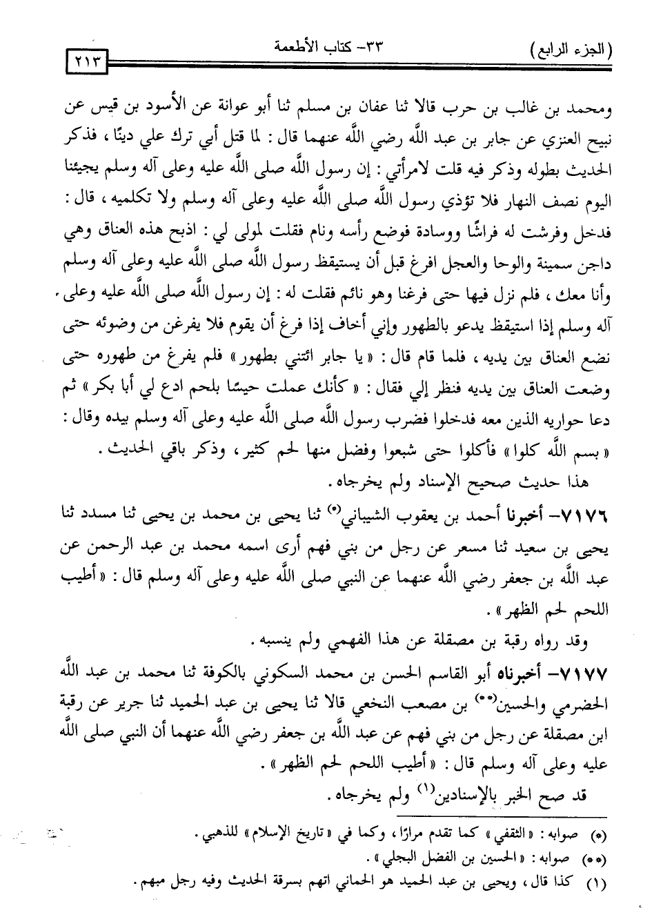 7177 - أَخْبَرَنَاهُ أَبُو الْقَاسِمِ الْحَسَنُ بْنُ مُحَمَّدٍ السَّكُونِيُّ ، بِالْكُوفَةِ ، ثَنَا مُحَمَّدُ بْنُ عَبْدِ اللَّهِ الْحَضْرَمِيُّ ، وَالْحُسَيْنُ بْنُ مُصْعَبٍ النَّخَعِيُّ ، قَالَا: ثَنَا يَحْيَى بْنُ عَبْدِ الْحَمِيدِ ، ثَنَا جَرِيرٌ ، عَنْ رَقَبَةَ بْنِ مَصْقَلَةَ * ، عَنْ رَجُلٍ ، مِنْ بَنِي فَهْمٍ ، عَنْ عَبْدِ اللَّهِ بْنِ جَعْفَرٍ ، رَضِيَ اللَّهُ عَنْهُمَا أَنَّ النَّبِيَّ صَلَّى اللَّهُ عَلَيْهِ وَسَلَّمَ قَالَ: " أَطْيَبُ اللَّحْمِ لَحْمُ الظَّهْرِ "