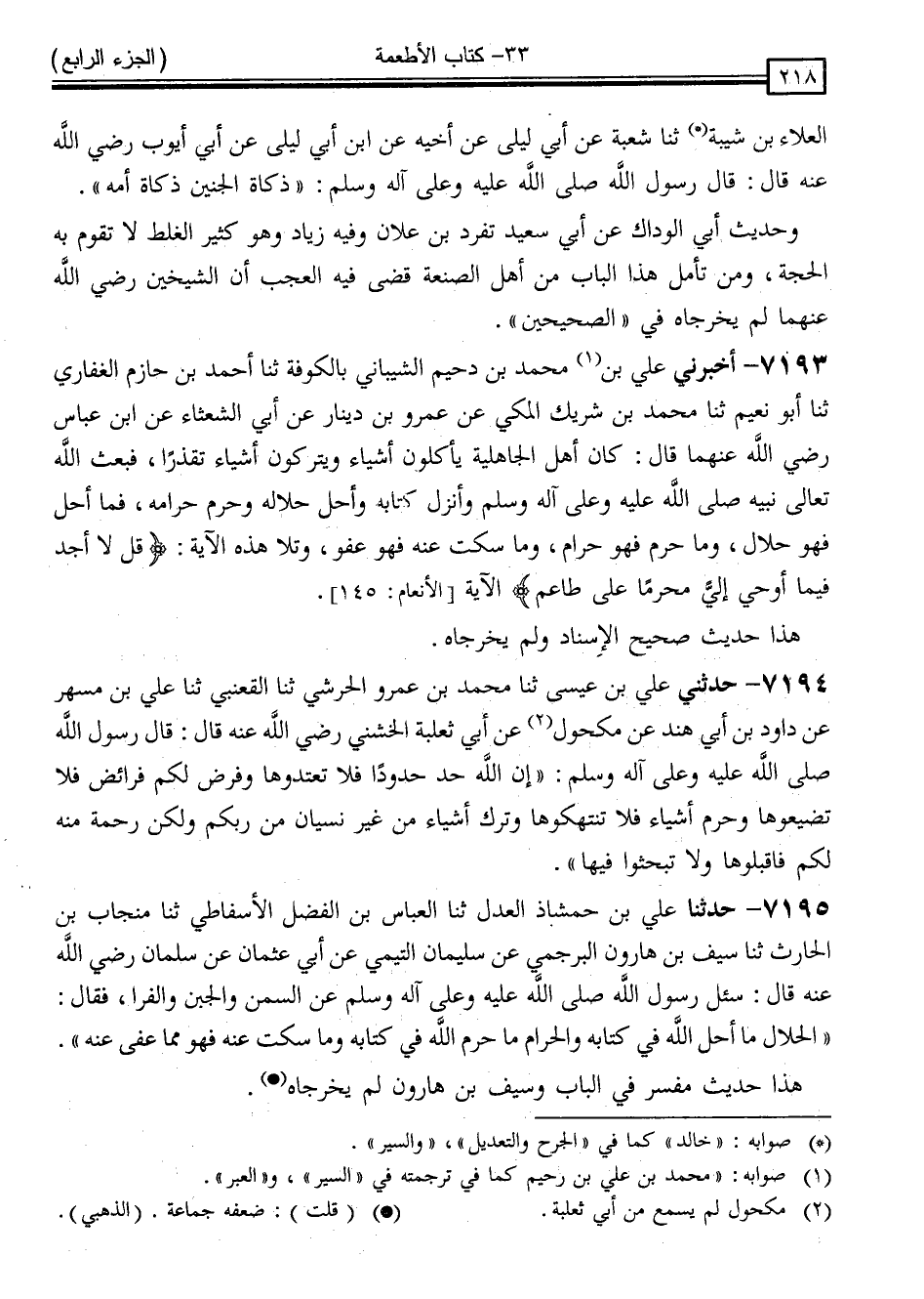 7193 - أَخْبَرَنِي عَلِيُّ بْنُ مُحَمَّدِ * بْنِ دُحَيْمٍ الشَّيْبَانِيُّ ، بِالْكُوفَةِ ، ثَنَا أَحْمَدُ بْنُ حَازِمٍ الْغِفَارِيُّ ، ثَنَا أَبُو نُعَيْمٍ ، ثَنَا مُحَمَّدُ بْنُ شَرِيكٍ الْمَكِّيُّ ، عَنْ عَمْرِو بْنِ دِينَارٍ ، عَنْ أَبِي الشَّعْثَاءِ ، عَنِ ابْنِ عَبَّاسٍ ، رَضِيَ اللَّهُ عَنْهُمَا قَالَ: " كَانَ أَهْلُ الْجَاهِلِيَّةِ يَأْكُلُونَ أَشْيَاءَ وَيَتْرُكُونَ أَشْيَاءَ تَقَذُّرًا فَبَعَثَ اللَّهُ تَعَالَى نَبِيَّهُ صَلَّى اللَّهُ عَلَيْهِ وَسَلَّمَ وَأَنْزَلَ كِتَابَهُ وَأَحَلَّ حَلَالَهُ وَحَرَّمَ حَرَامَهُ فَمَا أَحَلَّ فَهُوَ حَلَالٌ وَمَا حَرَّمَ فَهُوَ حَرَامٌ وَمَا سَكَتَ عَنْهُ فَهُوَ عَفُوٌّ " وَتَلَا هَذِهِ الْآيَةَ: { قُلْ لَا أَجِدُ فِي مَا أُوحِيَ إِلَيَّ مُحَرَّمًا عَلَى طَاعِمٍ } [الأنعام: 145] الْآيَةَ "