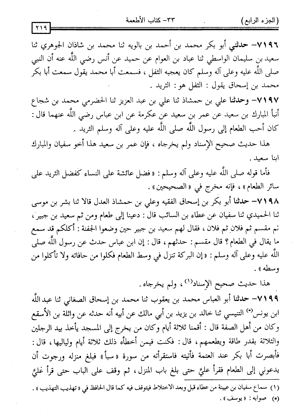 7196 - حَدَّثَنِي أَبُو بَكْرٍ مُحَمَّدُ بْنُ أَحْمَدَ بْنِ بَالَوَيْهِ ، ثَنَا مُحَمَّدُ بْنُ شَاذَانَ الْجَوْهَرِيُّ ، ثَنَا سَعِيدُ بْنُ سُلَيْمَانَ الْوَاسِطِيُّ ، ثَنَا عَبَّادُ بْنُ الْعَوَّامِ ، عَنْ حُمَيْدٍ ، عَنْ أَنَسٍ ، رَضِيَ اللَّهُ عَنْهُ " أَنَّ النَّبِيَّ صَلَّى اللَّهُ عَلَيْهِ وَسَلَّمَ كَانَ يُعْجِبُهُ الثُّفْلَ " فَسَمِعْتُ أَبَا مُحَمَّدٍ ، يَقُولُ: سَمِعْتُ أَبَا بَكْرٍمُحَمَّدُ بْنُ إِسْحَاقَ ، يَقُولُ: " الثُّفْلُ هُوَ الثَّرِيدُ "