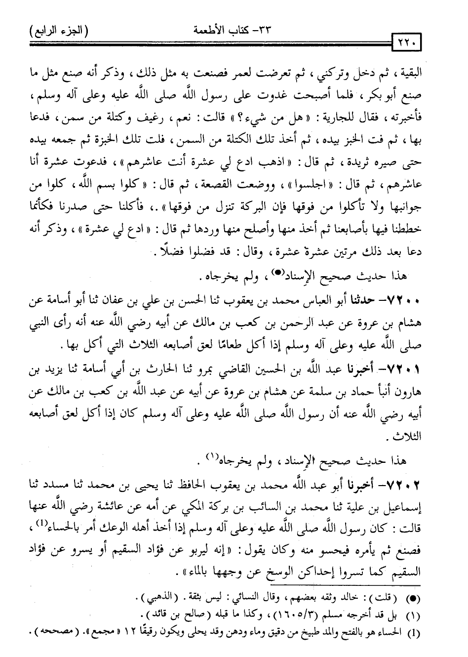 7202 - أَخْبَرَنَا أَبُو عَبْدِ اللَّهِ مُحَمَّدُ بْنُ يَعْقُوبَ الْحَافِظُ ، ثَنَا يَحْيَى بْنُ مُحَمَّدٍ ، ثَنَا مُسَدَّدٌ ، ثَنَا إِسْمَاعِيلُ ابْنُ عُلَيَّةَ ، ثَنَا مُحَمَّدُ بْنُ السَّائِبِ بْنِ بَرَكَةَ الْمَكِّيُّ ، عَنْ أُمِّهِ ، عَنْ عَائِشَةَ ، رَضِيَ اللَّهُ عَنْهَا قَالَتْ: كَانَ رَسُولُ اللَّهِ صَلَّى اللَّهُ عَلَيْهِ وَسَلَّمَ إِذَا أَخَذَ أَهْلَهُ الْوَعْكُ أَمَرَ بِالْحِسَاءِ فَصُنِعَ ثُمَّ يَأْمُرُهُ فَيَحْسُو مِنْهُ وَكَانَ يَقُولُ: " إِنَّهُ لَيَرْبُو عَنْ فُؤَادِ السَّقِيمِ - أَوْ يَسْرُو عَنْ فُؤَادِ السَّقِيمِ - كَمَا تَسْرُو إِحْدَاكُنَّ الْوَسَخَ عَنْ وَجْهِهَا بِالْمَاءِ " -[221]-