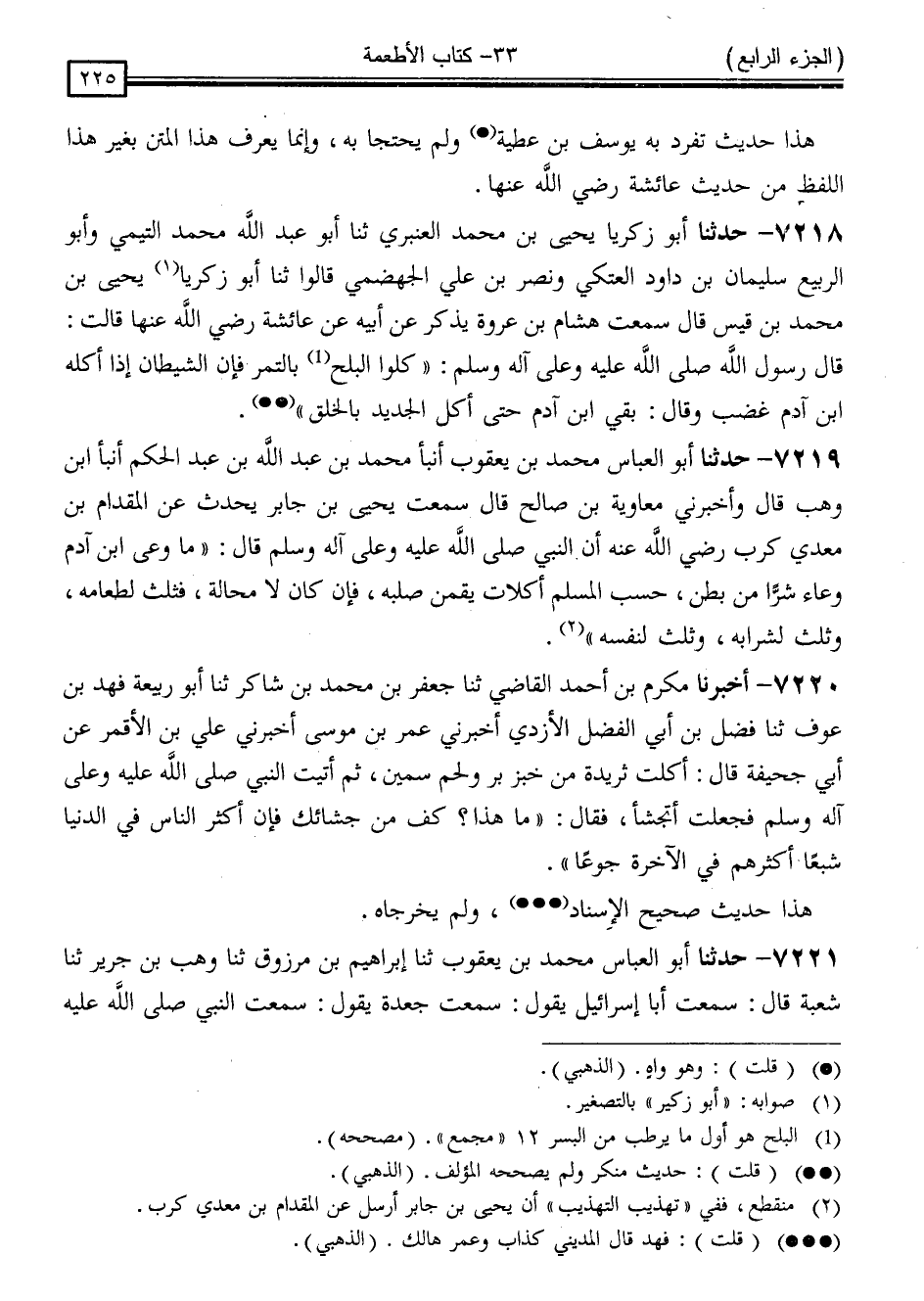 7221 - حَدَّثَنَا أَبُو الْعَبَّاسِ مُحَمَّدُ بْنُ يَعْقُوبَ ، ثَنَا إِبْرَاهِيمُ بْنُ مَرْزُوقٍ ، ثَنَا وَهْبُ بْنُ جَرِيرٍ ، ثَنَا شُعْبَةُ ، قَالَ: سَمِعْتُ أَبَا إِسْرَائِيلَ ، يَقُولُ: سَمِعْتُ جَعْدَةَ ، يَقُولُ: سَمِعْتُ النَّبِيَّ صَلَّى اللَّهُ عَلَيْهِ -[226]- وَسَلَّمَ يَقُولُ: وَرَأَى رَجُلًا مُشْبَعًا فَجَعَلَ النَّبِيُّ صَلَّى اللَّهُ عَلَيْهِ وَسَلَّمَ يُومِئُ بِيَدِهِ إِلَى بَطْنِهِ وَيَقُولُ: " لَوْ كَانَ هَذَا فِي غَيْرِ هَذَا كَانَ خَيْرًا لَهُ "