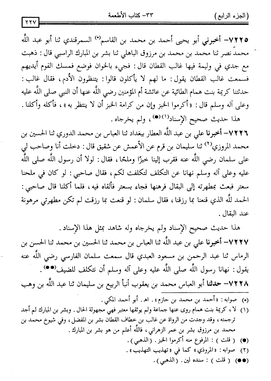 7225 - أَخْبَرَنِي أَبُو يَحْيَى أَحْمَدُ بْنُ مُحَمَّدِ بْنِ الْقَاسِمِ السَّمَرْقَنْدِيُّ ، ثَنَا أَبُو عَبْدِ اللَّهِ مُحَمَّدُ بْنُ نَصْرٍ ، ثَنَا مُحَمَّدُ بْنُ مُحَمَّدِ بْنِ مَرْزُوقٍ الْبَاهِلِيُّ ، ثَنَا بِشْرُ بْنُ الْمُبَارَكِ الرَّاسِبِيُّ ، قَالَ: ذَهَبْتُ مَعَ جَدِّي فِي وَلِيمَةٍ فِيهَا غَالِبٌ الْقَطَّانُ قَالَ: فَجِيءَ بِالْخِوَانِ فَوُضِعَ فَمَسَكَ الْقَوْمُ أَيْدِيَهُمْ فَسَمِعْتُ غَالِبًا الْقَطَّانَ يَقُولُ: مَا لَهُمْ لَا يَأْكُلُونَ ؟ قَالُوا: يَنْتَظِرُونَ الْأُدُمَ . فَقَالَ غَالِبٌ: حَدَّثَتْنَا كَرِيمَةُ بِنْتُ هَمَّامٍ الطَّائِيَّةُ ، عَنْ عَائِشَةَ ، أُمِّ الْمُؤْمِنِينَ رَضِيَ اللَّهُ عَنْهَا أَنَّ النَّبِيَّ صَلَّى اللَّهُ عَلَيْهِ وَسَلَّمَ قَالَ: " أَكْرِمُوا الْخُبْزَ وَإِنَّ كَرَامَةَ الْخُبْزِ أَنْ لَا يُنْتَظَرَ بِهِ " فَأَكَلَهُ وَأَكَلْنَا