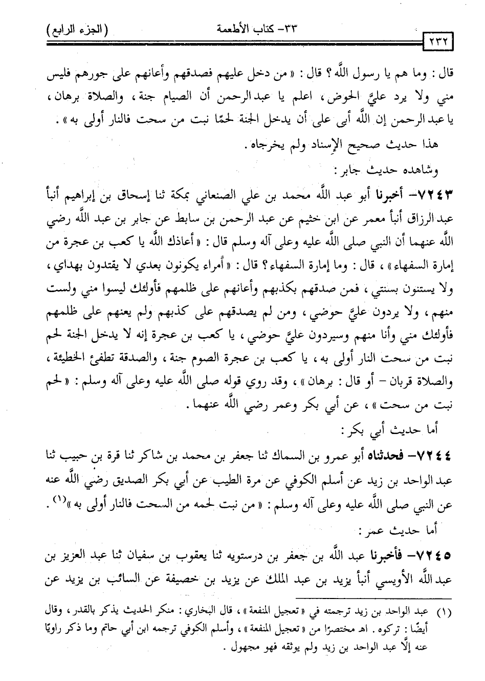 7243 - أَخْبَرَنَا أَبُو عَبْدِ اللَّهِ مُحَمَّدُ بْنُ عَلِيٍّ الصَّنْعَانِيُّ ، بِمَكَّةَ ، ثَنَا إِسْحَاقُ بْنُ إِبْرَاهِيمَ ، أنبأ عَبْدُ الرَّزَّاقِ ، أنبأ مَعْمَرٌ ، عَنِ ابْنِ خُثَيْمٍ ، عَنْ عَبْدِ الرَّحْمَنِ بْنِ سَابِطٍ ، عَنْ جَابِرِ بْنِ عَبْدِ اللَّهِ ، رَضِيَ اللَّهُ عَنْهُمَا أَنَّ النَّبِيَّ صَلَّى اللَّهُ عَلَيْهِ وَسَلَّمَ قَالَ: " أَعَاذَكَ اللَّهُ يَا كَعْبَ بْنَ عُجْرَةَ مِنْ إِمَارَةِ السُّفَهَاءِ " قَالَ: وَمَا إِمَارَةُ السُّفَهَاءِ ؟ قَالَ: " أُمَرَاءُ يَكُونُونَ بَعْدِي لَا يَقْتَدُونَ بِهُدَايَ وَلَا يَسْتَنُّونَ بِسُنَّتِي فَمَنْ صَدَّقَهُمْ بِكَذِبِهِمْ وَأَعَانَهُمْ عَلَى ظُلْمِهِمْ فَأُولَئِكَ لَيْسُوا مِنِّي وَلَسْتُ مِنْهُمْ وَلَا يَرِدُونَ عَلَى حَوْضِي ، وَمَنْ لَمْ يُصَدِّقْهُمْ عَلَى كَذِبِهِمْ وَلَمْ يُعِنْهُمْ عَلَى ظُلْمِهِمْ فَأُولَئِكَ مِنِّي وَأَنَا مِنْهُمْ وَسَيَرِدُونَ عَلَى حَوْضِي . يَا كَعْبَ بْنَ عُجْرَةَ إِنَّهُ لَا يَدْخُلُ الْجَنَّةَ لَحْمٌ نَبَتَ مِنْ سُحْتٍ ، النَّارُ أَوْلَى بِهِ . يَا كَعْبَ بْنَ عُجْرَةَ ، الصَّوْمُ جُنَّةٌ وَالصَّدَقَةُ تُطْفِئُ الْخَطِيئَةَ وَالصَّلَاةُ قُرْبَانٌ - أَوْ قَالَ: بُرْهَانٌ - "