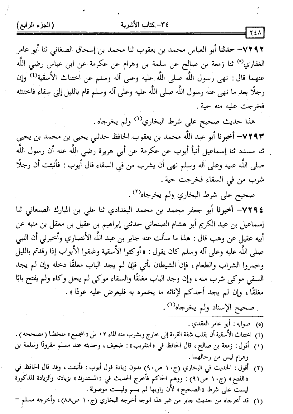 7292 - حَدَّثَنَا أَبُو الْعَبَّاسِ مُحَمَّدُ بْنُ يَعْقُوبَ ، ثَنَا مُحَمَّدُ بْنُ إِسْحَاقَ الصَّغَانِيُّ ، ثَنَا أَبُو عَامِرٍ الْغِفَارِيُّ ، ثَنَا زَمْعَةُ بْنُ صَالِحٍ ، عَنْ سَلَمَةَ بْنِ وَهْرَامَ ، عَنْ عِكْرِمَةَ ، عَنِ ابْنِ عَبَّاسٍ ، رَضِيَ اللَّهُ عَنْهُمَا قَالَ: " نَهَى رَسُولُ اللَّهِ صَلَّى اللَّهُ عَلَيْهِ وَسَلَّمَ عَنِ اخْتِنَاثِ الْأَسْقِيَةِ وَأَنَّ رَجُلًا بَعْدَمَا نَهَى عَنْهُ رَسُولُ اللَّهِ صَلَّى اللَّهُ عَلَيْهِ وَسَلَّمَ قَامَ بِاللَّيْلِ إِلَى سِقَاءٍ فَاخْتَنَثَهُ فَخَرَجَتْ عَلَيْهِ مِنْهُ حَيَّةٌ "