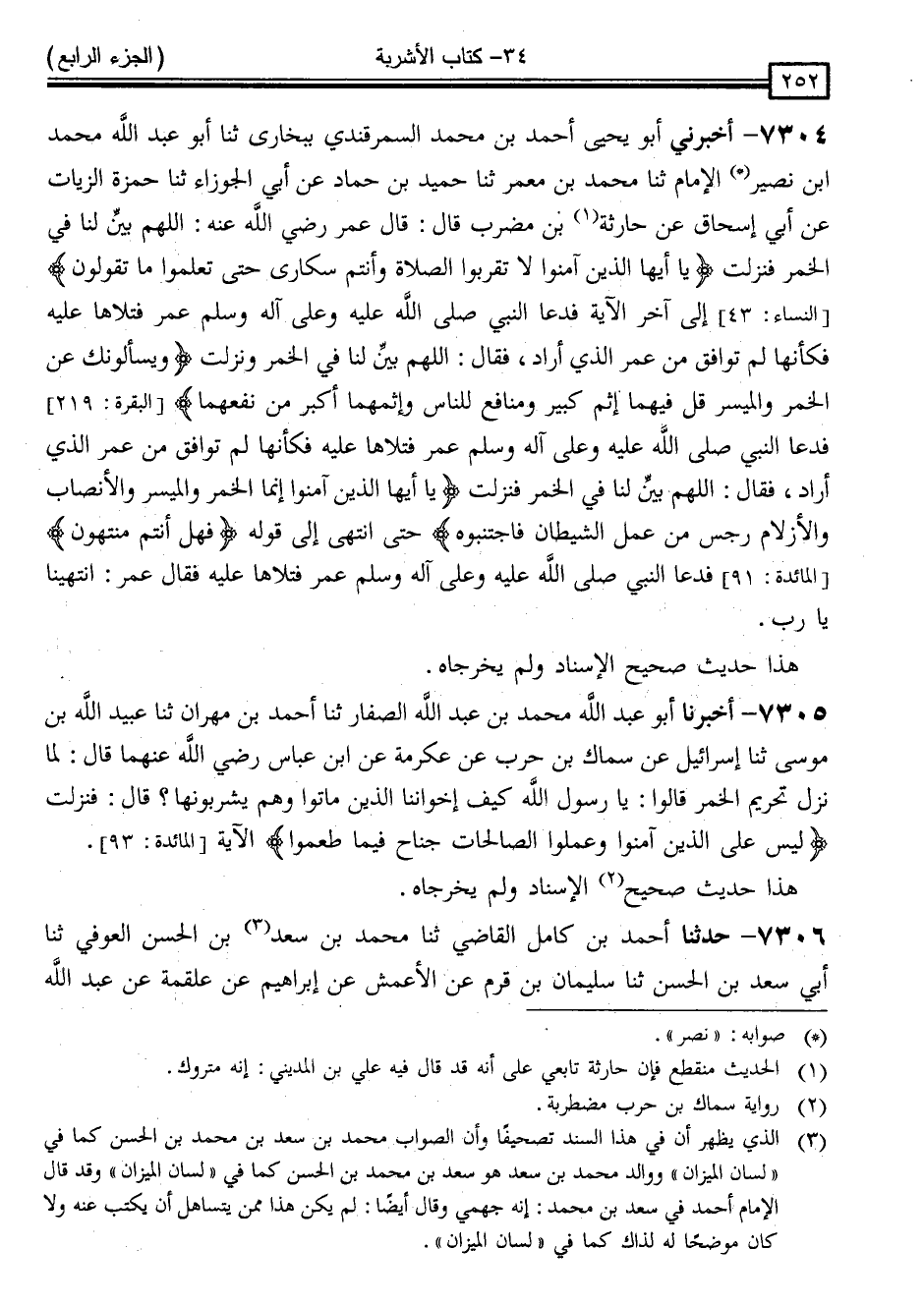 7304 - أَخْبَرَنِي أَبُو يَحْيَى أَحْمَدُ بْنُ مُحَمَّدٍ السَّمَرْقَنْدِيُّ ، بِبُخَارَى ، ثَنَا أَبُو عَبْدِ اللَّهِ مُحَمَّدُ بْنُ نُصَيْرٍ الْإِمَامُ ، ثَنَا مُحَمَّدُ بْنُ مَعْمَرٍ ، ثَنَا حُمَيْدُ بْنُ حَمَّادٍ ، عَنْ أَبِي الْجَوْزَاءِ ، ثَنَا حَمْزَةُ الزَّيَّاتُ ، عَنْ أَبِي إِسْحَاقَ ، عَنْ حَارِثَةَ بْنِ مُضَرَّبٍ ، قَالَ: قَالَ عُمَرُ ، رَضِيَ اللَّهُ عَنْهُ: اللَّهُمَّ بَيِّنْ لَنَا فِي الْخَمْرِ فَنَزَلَتْ: { يَا أَيُّهَا الَّذِينَ آمَنُوا لَا تَقْرَبُوا الصَّلَاةَ وَأَنْتُمْ سُكَارَى حَتَّى تَعَلَّمُوا مَا تَقُولُونَ } [النساء: 43] إِلَى آخِرِ الْآيَةِ ، " فَدَعَا النَّبِيُّ صَلَّى اللَّهُ عَلَيْهِ وَسَلَّمَ عُمَرَ فَتَلَاهَا عَلَيْهِ " فَكَأَنَّهَا لَمْ تُوَافِقْ مِنْ عُمَرَ الَّذِي أَرَادَ فَقَالَ: اللَّهُمَّ بَيِّنْ لَنَا فِي الْخَمْرِ فَنَزَلَتْ: { يَسْأَلُونَكَ عَنِ الْخَمْرِ وَالْمَيْسِرِ قُلْ فِيهِمَا إِثْمٌ كَبِيرٌ وَمَنَافِعُ لِلنَّاسِ وَإِثْمُهُمَا أَكْبَرُ مِنْ نَفْعِهِمَا } [البقرة: 219] ، " فَدَعَا النَّبِيُّ صَلَّى اللَّهُ عَلَيْهِ وَسَلَّمَ عُمَرَ فَتَلَاهَا عَلَيْهِ " فَكَأَنَّهَا لَمْ تُوَافِقْ مِنْ عُمَرَ الَّذِي أَرَادَ فَقَالَ: اللَّهُمَّ بَيِّنْ لَنَا فِي الْخَمْرِ فَنَزَلَتْ: { يَا أَيُّهَا الَّذِينَ آمَنُوا إِنَّمَا الْخَمْرُ وَالْمَيْسِرُ وَالْأَنْصَابُ وَالْأَزْلَامُ رِجْسٌ مِنْ عَمَلِ الشَّيْطَانِ فَاجْتَنِبُوهُ } [المائدة: 90] حَتَّى انْتَهَى إِلَى قَوْلِهِ: { فَهَلْ أَنْتُمْ مُنْتَهُونَ } [المائدة: 91] " فَدَعَا النَّبِيُّ صَلَّى اللَّهُ عَلَيْهِ وَسَلَّمَ عُمَرَ فَتَلَاهَا عَلَيْهِ " فَقَالَ عُمَرُ: انْتَهَيْنَا يَا رَبِّ