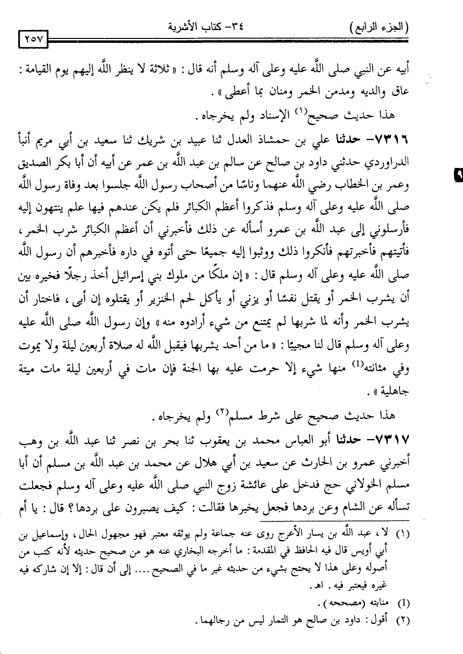 7316 - حَدَّثَنَا عَلِيُّ بْنُ حَمْشَاذَ الْعَدْلُ ، ثَنَا عُبَيْدُ بْنُ شَرِيكٍ ، ثَنَا سَعِيدُ بْنُ أَبِي مَرْيَمَ ، أَنْبَأَ الدَّرَاوَرْدِيُّ ، حَدَّثَنِي دَاوُدُ بْنُ صَالِحٍ ، عَنْ سَالِمِ بْنِ عَبْدِ اللَّهِ بْنِ عُمَرَ ، عَنْ أَبِيهِ ، أَنَّ أَبَا بَكْرٍ الصِّدِّيقَ ، وَعُمَرَ بْنَ الْخَطَّابِ رَضِيَ اللَّهُ عَنْهُمَا ، وَنَاسًا مِنْ أَصْحَابِ رَسُولِ اللَّهِ صَلَّى اللَّهُ عَلَيْهِ وَسَلَّمَ جَلَسُوا بَعْدَ وَفَاةِ رَسُولِ اللَّهِ صَلَّى اللَّهُ عَلَيْهِ وَسَلَّمَ فَذَكَرُوا أَعْظَمَ الْكَبَائِرِ فَلَمْ يَكُنْ عِنْدَهُمْ فِيهَا عِلْمٌ يَنْتَهُونَ إِلَيْهِ فَأَرْسَلُونِي إِلَى عَبْدِ اللَّهِ بْنِ عَمْرٍو ، أَسْأَلُهُ عَنْ ذَلِكَ فَأَخْبَرَنِي أَنَّ أَعْظَمَ الْكَبَائِرِ شُرْبُ الْخَمْرِ فَأَتَيْتُهُمْ فَأَخْبَرْتُهُمْ فَأَنْكَرُوا ذَلِكَ وَوَثَبُوا إِلَيْهِ جَمِيعًا حَتَّى أَتَوْهُ فِي دَارِهِ فَأَخْبَرَهُمْ أَنَّ رَسُولَ اللَّهِ صَلَّى اللَّهُ عَلَيْهِ وَسَلَّمَ قَالَ: " إِنَّ مَلِكًا مِنْ مُلُوكِ بَنِي إِسْرَائِيلَ أَخَذَ رَجُلًا فَخَيَّرَهُ بَيْنَ أَنْ يَشْرَبَ الْخَمْرَ أَوْ يَقْتُلَ نَفْسًا أَوْ يَزْنِيَ أَوْ يَأْكُلَ لَحْمَ الْخِنْزِيرِ أَوْ يَقْتُلُوهُ إِنْ أَبَى فَاخْتَارَ أَنْ يَشْرَبَ الْخَمْرَ وَأَنَّهُ لَمَّا شَرِبَهَا لَمْ يَمْتَنِعْ مِنْ شَيْءٍ أَرَادُوهُ مِنْهُ " وَأَنَّ رَسُولَ اللَّهِ صَلَّى اللَّهُ عَلَيْهِ وَسَلَّمَ قَالَ لَنَا مُجِيبًا: " مَا مِنْ أَحَدٍ يَشْرَبُهَا فَيَقْبَلَ اللَّهُ لَهُ صَلَاةً أَرْبَعِينَ لَيْلَةً وَلَا يَمُوتُ وَفِي مَثَانَتِهِ مِنْهَا شَيْءٌ إِلَّا حُرِّمَتْ عَلَيْهِ بِهَا الْجَنَّةُ ، فَإِنْ مَاتَ فِي أَرْبَعِينَ لَيْلَةً مَاتَ مَيْتَةً جَاهِلِيَّةً "