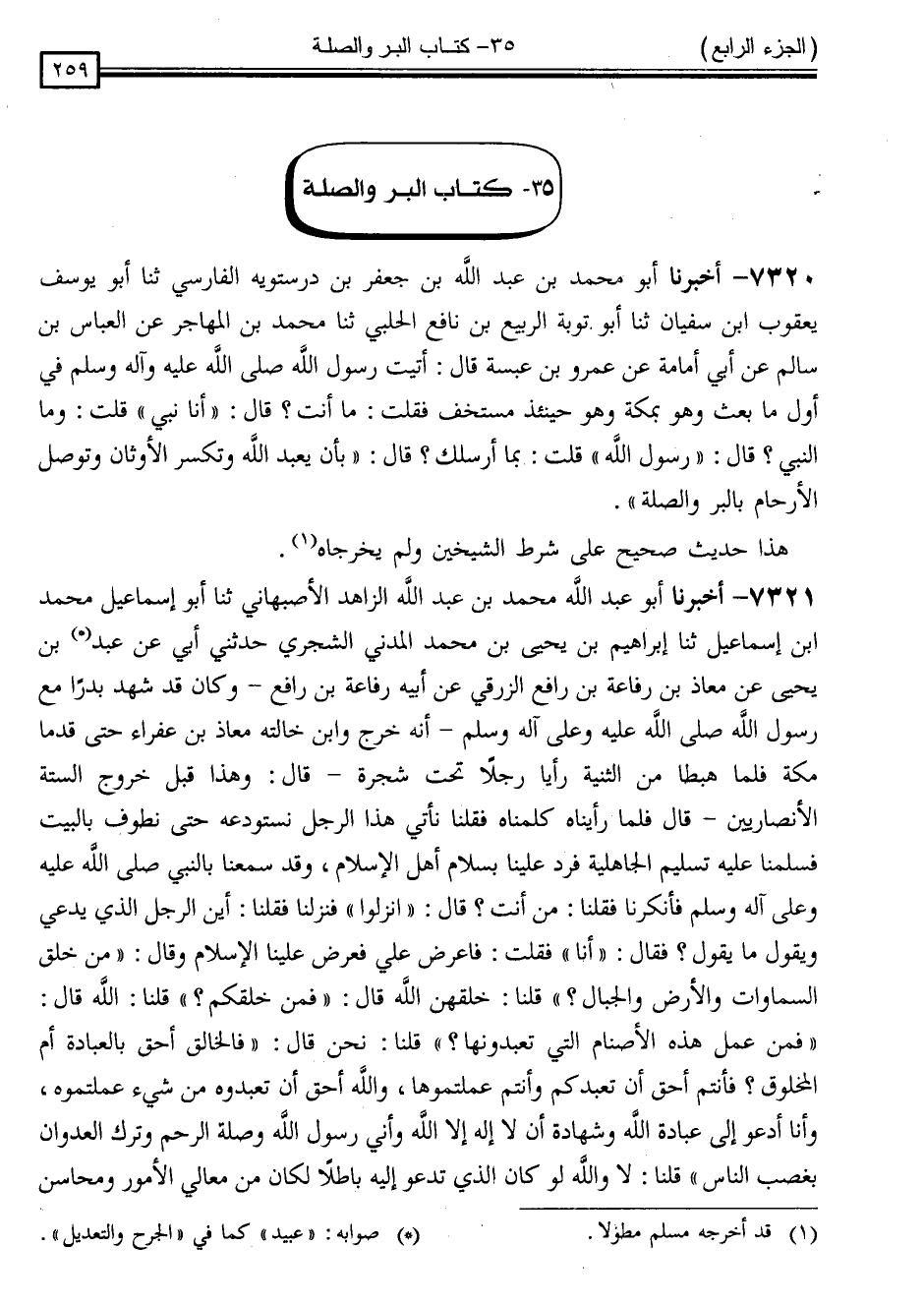7320 - أَخْبَرَنَا أَبُو مُحَمَّدٍ عَبْدُ اللَّهِ بْنُ جَعْفَرِ بْنِ دَرَسْتَوَيْهِ الْفَارِسِيُّ ، ثَنَا أَبُو يُوسُفَ يَعْقُوبُ بْنُ سُفْيَانَ ، ثَنَا أَبُو تَوْبَةَ الرَّبِيعُ بْنُ نَافِعٍ الْحَلَبِيُّ ، ثَنَا مُحَمَّدُ بْنُ الْمُهَاجِرِ ، عَنِ الْعَبَّاسِ بْنِ سَالِمٍ ، عَنْ أَبِي أُمَامَةَ ، عَنْ عَمْرِو بْنِ عَبَسَةَ ، قَالَ: أَتَيْتُ رَسُولَ اللَّهِ صَلَّى اللَّهُ عَلَيْهِ وَسَلَّمَ فِي أَوَّلِ مَا بُعِثَ وَهُوَ بِمَكَّةَ وَهُوَ حِينَئِذٍ مُسْتَخْفٍ فَقُلْتُ: مَا أَنْتَ ؟ قَالَ: " أَنَا نَبِيٌّ " قُلْتُ: وَمَا النَّبِيُّ ؟ قَالَ: " رَسُولُ اللَّهِ " قُلْتُ: بِمَا أَرْسَلَكَ ؟ قَالَ: " بِأَنْ يُعْبَدَ اللَّهُ وَتُكْسَرَ الْأَوْثَانُ وَتُوصَلَ الْأَرْحَامُ بِالْبِرِّ وَالصِّلَةِ "
