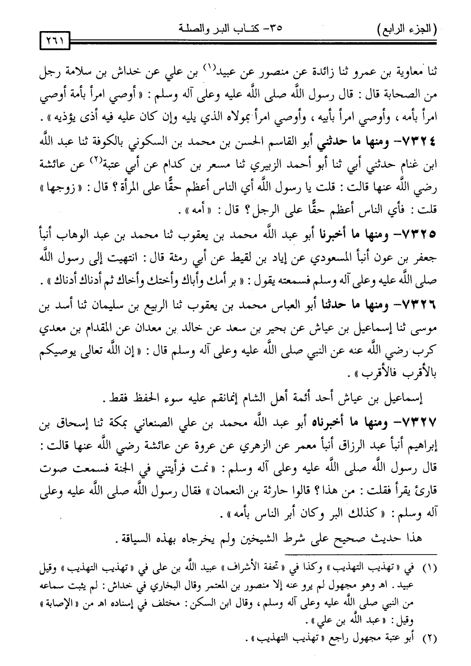 7324 - مَا حَدَّثَنِي أَبُو الْقَاسِمِ الْحَسَنُ بْنُ مُحَمَّدِ بْنِ السَّكُونِيِّ ، بِالْكُوفَةِ ، ثَنَا عَبْدُ اللَّهِ بْنُ غَنَّامٍ ، حَدَّثَنِي أَبِي ، ثَنَا أَبُو أَحْمَدَ الزُّبَيْرِيُّ ، ثَنَا مِسْعَرُ بْنُ كِدَامٍ ، عَنْ أَبِي عُتْبَةَ ، عَنْ عَائِشَةَ ، رَضِيَ اللَّهُ عَنْهَا قَالَتْ: قُلْتُ: يَا رَسُولَ اللَّهِ أَيُّ النَّاسِ أَعْظَمُ حَقًّا عَلَى الْمَرْأَةِ ؟ قَالَ: " زَوْجُهَا " قُلْتُ: فَأَيُّ النَّاسِ أَعْظَمُ حَقًّا عَلَى الرَّجُلِ ؟ قَالَ: " أُمُّهُ "
