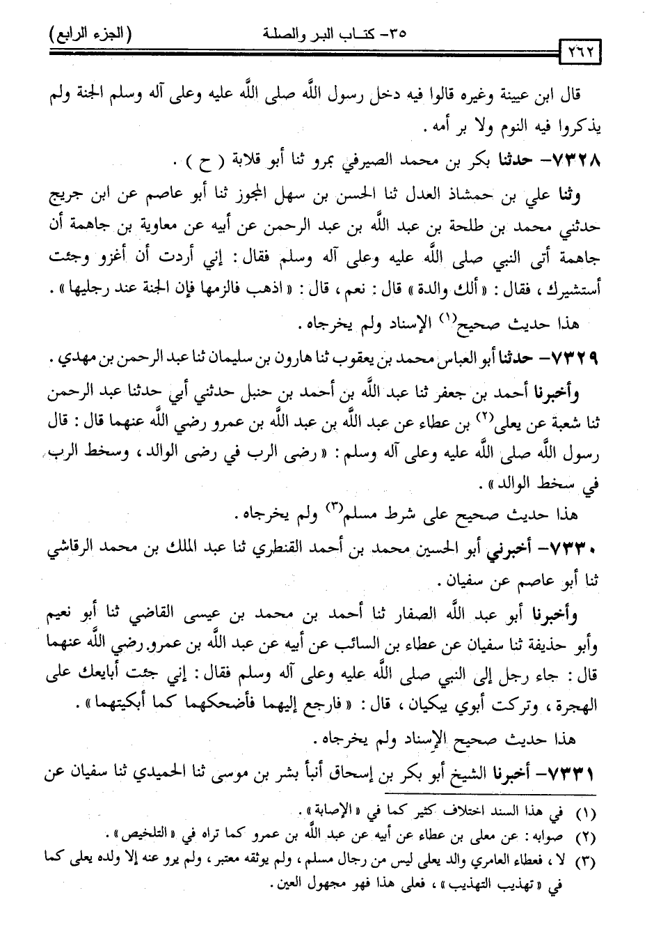 7329 - حَدَّثَنَا أَبُو الْعَبَّاسِ مُحَمَّدُ بْنُ يَعْقُوبَ ، ثَنَا هَارُونُ بْنُ سُلَيْمَانَ ، ثَنَا عَبْدُ الرَّحْمَنِ بْنُ مَهْدِيٍّ ، وَأَخْبَرَنَا أَحْمَدُ بْنُ جَعْفَرٍ ، ثَنَا عَبْدُ اللَّهِ بْنُ أَحْمَدَ بْنِ حَنْبَلٍ ، حَدَّثَنِي أَبِي ، حَدَّثَنَا عَبْدُ الرَّحْمَنِ ، ثَنَا شُعْبَةُ ، عَنْ يَعْلَى بْنِ عَطَاءٍ ، عَنْ عَبْدِ اللَّهِ بْنِ عَبْدِ اللَّهِ بْنِ عَمْرٍو * ، رَضِيَ اللَّهُ عَنْهُمَا قَالَ: قَالَ رَسُولُ اللَّهِ صَلَّى اللَّهُ عَلَيْهِ وَسَلَّمَ: " رِضَا الرَّبِّ فِي رِضَا الْوَالِدِ وَسَخِطُ الرَّبِّ فِي سَخَطِ الْوَالِدِ "