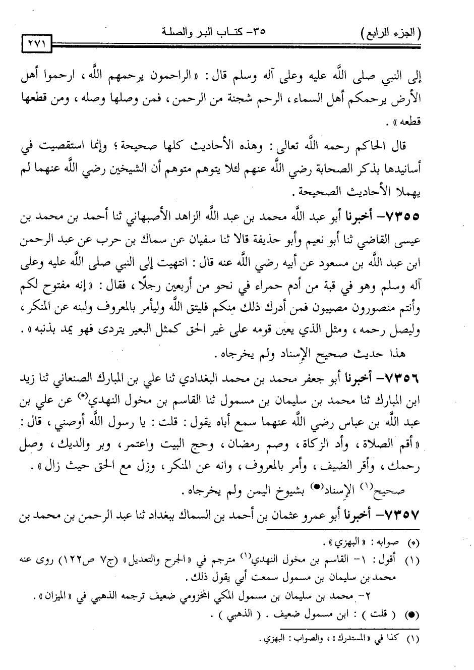 7357 - أَخْبَرَنَا أَبُو عَمْرٍو عُثْمَانُ بْنُ أَحْمَدَ بْنِ السَّمَّاكِ ، بِبَغْدَادَ ، ثَنَا عَبْدُ الرَّحْمَنِ بْنُ مُحَمَّدِ بْنِ -[272]- مَنْصُورٍ الْحَارِثِيُّ ، ثَنَا يَحْيَى بْنُ سَعِيدٍ الْقَطَّانُ ، عَنْ عَوْفٍ ، وَأَبِي * الْحَسَنِ بْنِ يَعْقُوبَ الْعَدْلِ ، ثَنَا يَحْيَى بْنُ أَبِي طَالِبٍ ، ثَنَا عَبْدُ الْوَهَّابِ بْنُ عَطَاءٍ ، أَنْبَأَ عَوْفُ بْنُ أَبِي جَمِيلَةَ ، عَنْ زُرَارَةَ بْنِ أَوْفَى ، عَنْ عَبْدِ اللَّهِ بْنِ سَلَّامٍ ، قَالَ: لَمَّا قَدِمَ رَسُولُ اللَّهِ صَلَّى اللَّهُ عَلَيْهِ وَسَلَّمَ جَفَلَ النَّاسُ إِلَيْهِ وَقِيلَ: قَدِمَ رَسُولُ اللَّهِ صَلَّى اللَّهُ عَلَيْهِ وَسَلَّمَ فَجِئْتُ فِي النَّاسِ لِأَنْظُرَ إِلَيْهِ فَلَمَّا اسْتَبَنْتُ وَجْهَ رَسُولِ اللَّهِ صَلَّى اللَّهُ عَلَيْهِ وَسَلَّمَ عَرَفْتُ أَنَّ وَجْهَهُ لَيْسَ بِوَجْهِ كَذَّابٍ فَكَانَ أَوَّلُ شَيْءٍ تَكَلَّمَ بِهِ أَنْ قَالَ: " يَا أَيُّهَا النَّاسُ أَفْشُوا السَّلَامَ وَأَطْعِمُوا الطَّعَامَ وَصِلُوا الْأَرْحَامَ وَصَلُّوا بِاللَّيْلِ وَالنَّاسُ نِيَامٌ تَدْخُلُوا الْجَنَّةَ بِسَلَامٍ "
