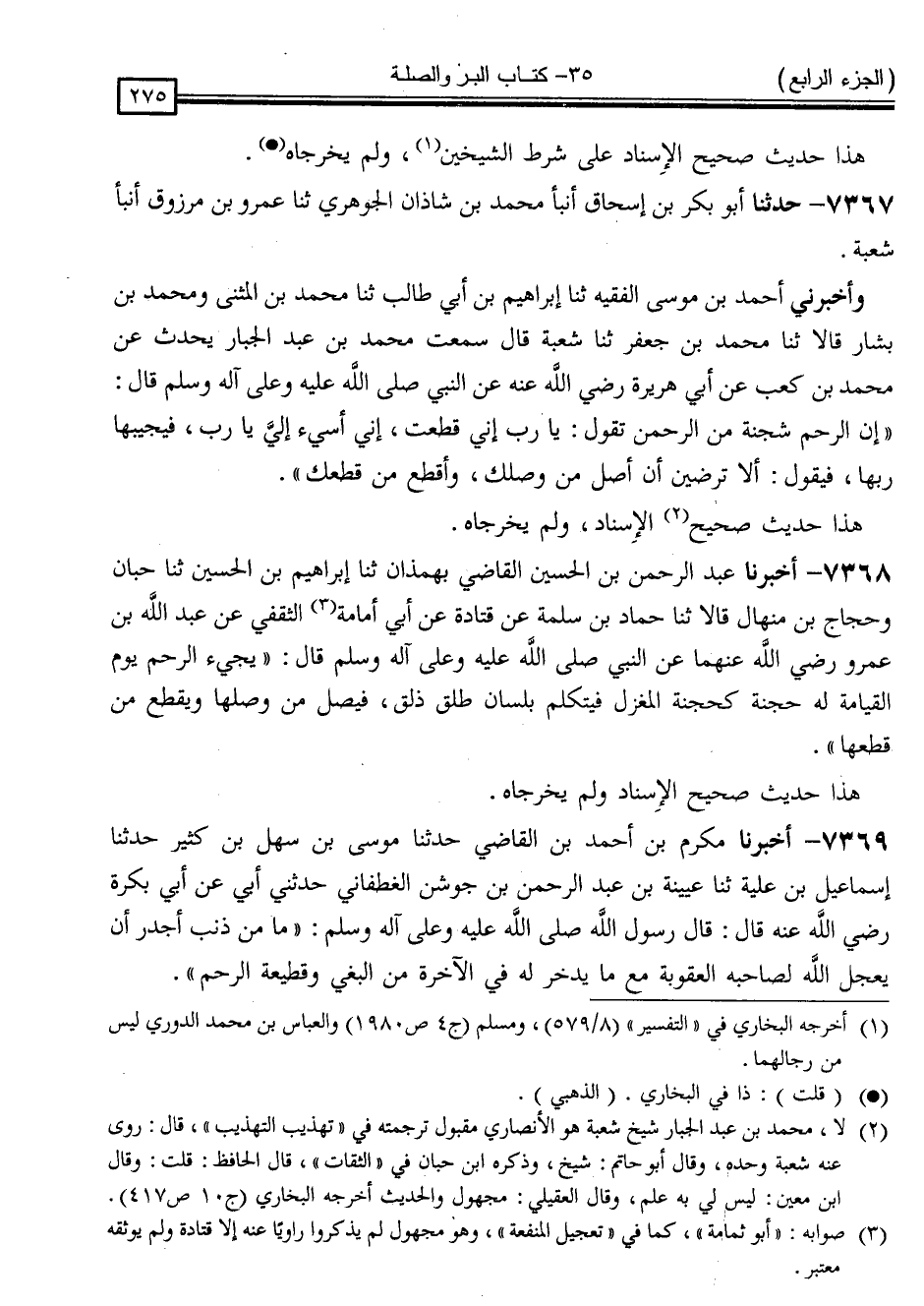 7368 - أَخْبَرَنَا عَبْدُ الرَّحْمَنِ بْنُ الْحُسَيْنِ * الْقَاضِي ، بِهَمْدَانَ ، ثَنَا إِبْرَاهِيمُ بْنُ الْحُسَيْنِ ، ثَنَا حِبَّانُ ** ، وَحَجَّاجُ بْنُ مِنْهَالٍ ، قَالَا: ثَنَا حَمَّادُ بْنُ سَلَمَةَ ، عَنْ قَتَادَةَ ، عَنْ أَبِي أُمَامَةَ *** الثَّقَفِيِّ ، عَنْ عَبْدِ اللَّهِ بْنِ عَمْرٍو ، رَضِيَ اللَّهُ عَنْهُمَا ، عَنِ النَّبِيِّ صَلَّى اللَّهُ عَلَيْهِ وَسَلَّمَ قَالَ: " يَجِيءُ الرَّحِمُ يَوْمَ الْقِيَامَةِ لَهُ حُجْنَةٌ كَحُجْنَةِ الْمِغْزَلِ ، فَيَتَكَلَّمُ بِلِسَانٍ طَلْقٍ ذَلْقٍ فَيَصِلُ مَنْ وَصَلَهَا وَيَقْطَعُ مَنْ قَطَعَهَا "
