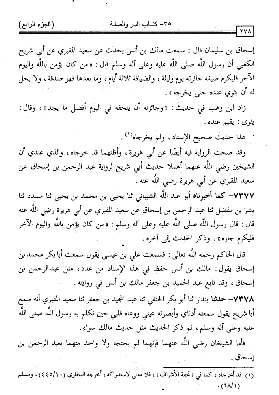 7377 - كَمَا أَخْبَرَنَاهُ أَبُو عَبْدِ اللَّهِ الشَّيْبَانِيُّ ، ثَنَا يَحْيَى بْنُ مُحَمَّدِ بْنِ يَحْيَى ، ثَنَا مُسَدَّدٌ ، ثَنَا بِشْرُ بْنُ مُفَضَّلٍ ، ثَنَا عَبْدُ الرَّحْمَنِ بْنُ إِسْحَاقَ ، عَنْ سَعِيدٍ الْمَقْبُرِيِّ ، عَنْ أَبِي هُرَيْرَةَ ، رَضِيَ اللَّهُ عَنْهُ قَالَ: قَالَ رَسُولُ اللَّهِ صَلَّى اللَّهُ عَلَيْهِ وَسَلَّمَ: " مَنْ كَانَ يُؤْمِنُ بِاللَّهِ وَالْيَوْمِ الْآخِرِ فَلْيُكْرِمْ جَارَهُ " وَذَكَرَ الْحَدِيثَ إِلَى آخِرِهِ
