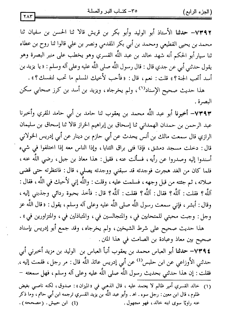 7394 - حَدَّثَنَا أَبُو الْعَبَّاسِ مُحَمَّدُ بْنُ يَعْقُوبَ ، أَنْبَأَ الْعَبَّاسُ بْنُ الوَلِيدِ بْنِ مَزْيَدٍ ، أَخْبَرَنِي أَبِي ، حَدَّثَنِي الْأَوْزَاعِيُّ ، عَنِ ابْنِ حَلْبَسٍ ، عَنْ أَبِي إِدْرِيسَ عَائِذِ اللَّهِ ، قَالَ: مَرَّ رَجُلٌ فَقُمْتُ إِلَيْهِ فَقُلْتُ: إِنَّ هَذَا حَدَّثَنِي بِحَدِيثِ رَسُولِ اللَّهِ صَلَّى اللَّهُ عَلَيْهِ وَسَلَّمَ فَهَلْ سَمِعْتَهُ ؟ -[284]- يَعْنِي مُعَاذًا ، قَالَ: مَا كَانَ يُحَدِّثُكَ إِلَّا حَقًّا ، فَأَخْبَرْتُهُ قَالَ: قَدْ سَمِعْتُ هَذَا مِنْ رَسُولِ اللَّهِ صَلَّى اللَّهُ عَلَيْهِ وَسَلَّمَ يَعْنِي فِي الْمُتَحَابِّينَ فِي اللَّهِ يُظِلُّهُمُ اللَّهُ فِي ظِلِّ عَرْشِهِ يَوْمَ لَا ظِلَّ إِلَّا ظِلُّهُ ، وَمَا هُوَ أَفْضَلُ مِنْهُ . قُلْتُ: إِيْ رَحِمَكَ اللَّهُ وَمَا هُوَ أَفْضَلُ مِنْهُ: قَالَ: سَمِعْتُ رَسُولَ اللَّهِ صَلَّى اللَّهُ عَلَيْهِ وَسَلَّمَ يَأْثُرُ عَنِ اللَّهِ عَزَّ وَجَلَّ قَالَ: " حَقَّتْ مَحَبَّتِي لِلْمُتَحَابِّينَ فِيَّ ، وَحَقَّتْ مَحَبَّتِي لِلْمُتَوَاصِلِينَ فِيَّ ، وَحَقَّتْ مَحَبَّتِي لِلْمُتَزَاوِرِينَ فِيَّ ، وَحَقَّتْ مَحَبَّتِي لِلْمُتَبَاذِلِينَ فِيَّ " وَلَا أَدْرِي بِأَيَّتِهِمَا بَدَأَ . قُلْتُ: مَنْ أَنْتَ رَحِمَكَ اللَّهُ ؟ قَالَ: أَنَا عُبَادَةُ بْنُ الصَّامِتِ ،