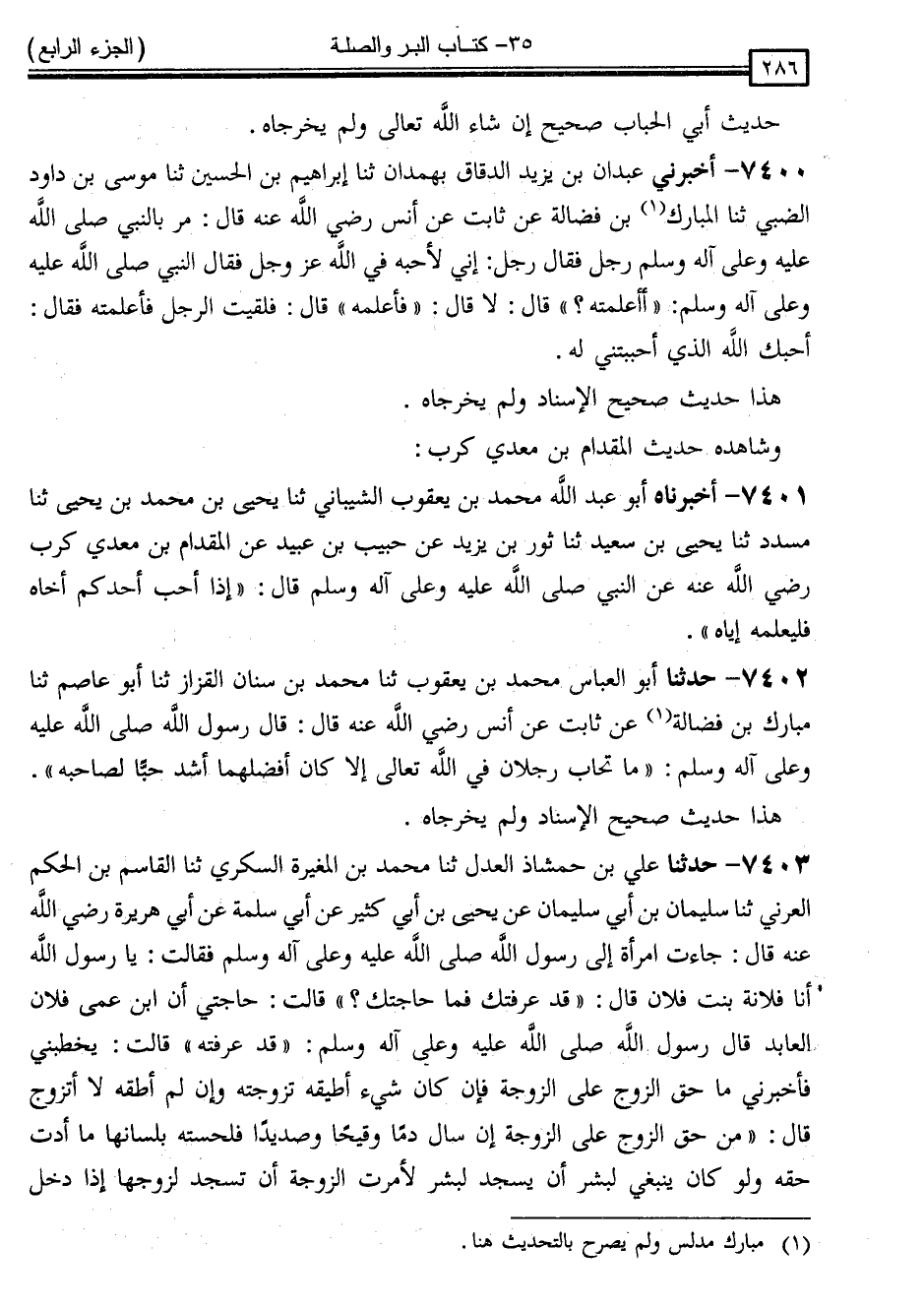 7400 - أَخْبَرَنِي عَبْدَانُ بْنُ يَزِيدَ الدَّقَّاقُ ، بِهَمْدَانَ ، ثَنَا إِبْرَاهِيمُ بْنُ الْحُسَيْنِ ، ثَنَا مُوسَى بْنُ دَاوُدَ الضَّبِّيُّ ، ثَنَا الْمُبَارَكُ بْنُ فَضَالَةَ ، عَنْ ثَابِتٍ ، عَنْ أَنَسٍ رَضِيَ اللَّهُ عَنْهُ ، قَالَ: مَرَّ بِالنَّبِيِّ صَلَّى اللَّهُ عَلَيْهِ وَسَلَّمَ رَجُلٌ ، فَقَالَ رَجُلٌ: إِنِّي لَأُحِبُّهُ فِي اللَّهِ عَزَّ وَجَلَّ . فَقَالَ النَّبِيُّ صَلَّى اللَّهُ عَلَيْهِ وَسَلَّمَ: " أَأَعْلَمْتَهُ ؟ " قَالَ: لَا . قَالَ: " فَأَعْلِمْهُ " . قَالَ: فَلَقِيتُ الرَّجُلَ فَأَعْلَمْتُهُ . فَقَالَ: أَحَبَّكَ اللَّهُ الَّذِي أَحْبَبْتَنِي لَهُ