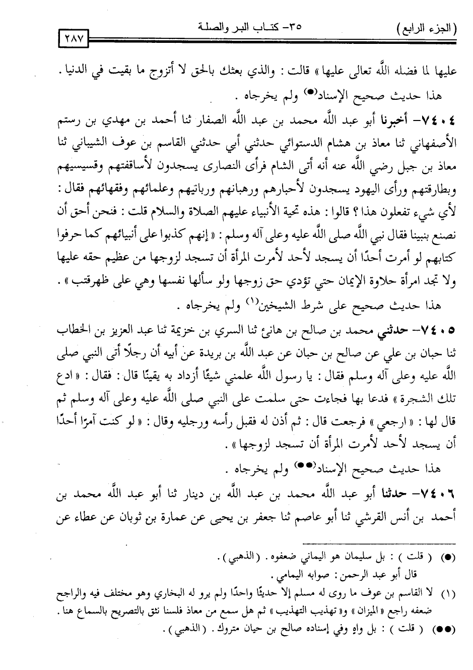 7404 - أَخْبَرَنَا أَبُو عَبْدِ اللَّهِ مُحَمَّدُ بْنُ عَبْدِ اللَّهِ الصَّفَّارُ ، ثَنَا أَحْمَدُ بْنُ مَهْدِيِّ بْنِ رُسْتُمٍ الْأَصْفَهَانِيُّ ، ثَنَا مُعَاذُ بْنُ هِشَامٍ الدَّسْتُوَائِيُّ ، حَدَّثَنِي أَبِي ، حَدَّثَنِي الْقَاسِمُ بْنُ عَوْفٍ الشَّيْبَانِيُّ ، ثَنَا مُعَاذُ بْنُ جَبَلٍ رَضِيَ اللَّهُ عَنْهُ ، أَنَّهُ أَتَى الشَّامَ فَرَأَى النَّصَارَى يَسْجُدُونَ لِأَسَاقِفَتِهِمْ وَقِسِّيسِيهِمْ وَبَطَارِقَتِهِمْ ، وَرَأَى الْيَهُودَ يَسْجُدُونَ لِأَحْبَارِهِمْ وَرُهْبَانِهِمْ وَرُبَّانِيهِمْ وَعُلَمَائِهِمْ وَفُقَهَائِهِمْ ، فَقَالَ: لِأَيِّ شَيْءٍ تَفْعَلُونَ هَذَا ؟ قَالُوا: هَذِهِ تَحِيَّةُ الْأَنْبِيَاءِ عَلَيْهِمُ الصَّلَاةُ وَالسَّلَامُ . قُلْتُ: فَنَحْنُ أَحَقُّ أَنْ نَصْنَعَ بِنَبِيِّنَا ، فَقَالَ نَبِيُّ اللَّهُ صَلَّى اللَّهُ عَلَيْهِ وَسَلَّمَ: " إِنَّهُمْ كَذَبُوا عَلَى أَنْبِيَائِهِمْ كَمَا حَرَّفُوا كِتَابَهُمْ ، لَوْ أَمَرْتُ أَحَدًا أَنْ يَسْجُدَ لِأَحَدٍ لَأَمَرْتُ الْمَرْأَةَ أَنْ تَسْجُدَ لِزَوْجِهَا مِنْ عَظِيمِ حَقِّهِ عَلَيْهَا ، وَلَا تَجِدُ امْرَأَةٌ حَلَاوَةَ الْإِيمَانِ حَتَّى تُؤَدِّيَ حَقَّ زَوْجِهَا وَلَوْ سَأَلَهَا نَفْسَهَا وَهِيَ عَلَى ظَهْرِ قَتَبٍ "