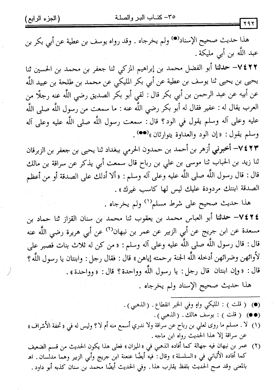 7422 - حَدَّثَنَا أَبُو الْفَضْلِ مُحَمَّدُ بْنُ إِبْرَاهِيمَ الْمُزَكِّي ، ثَنَا جَعْفَرُ بْنُ مُحَمَّدِ بْنِ الْحُسَيْنِ ، ثَنَا يَحْيَى بْنُ يَحْيَى ، ثَنَا يُوسُفُ بْنُ عَطِيَّةَ ، عَنْ أَبِي بَكْرٍ الْمُلَيْكِيُّ ، عَنْ مُحَمَّدِ بْنِ طَلْحَةَ بْنِ عُبَيْدِ اللَّهِ ، عَنْ أَبِيهِ ، عَنْ عَبْدِ الرَّحْمَنِ بْنِ أَبِي بَكْرٍ ، قَالَ: لَقِيَ أَبُو بَكْرٍ الصِّدِّيقُ رَضِيَ اللَّهُ عَنْهُ رَجُلًا مِنَ الْعَرَبِ يُقَالُ لَهُ: عُفَيْرٌ ، فَقَالَ لَهُ أَبُو بَكْرٍ رَضِيَ اللَّهُ عَنْهُ: مَا سَمِعْتَ مِنْ رَسُولِ اللَّهِ صَلَّى اللَّهُ عَلَيْهِ وَسَلَّمَ يَقُولُ فِي الْوُدِّ ؟ قَالَ: سَمِعْتُ رَسُولَ اللَّهِ صَلَّى اللَّهُ عَلَيْهِ وَسَلَّمَ يَقُولُ: " إِنَّ الْوُدَّ وَالْعَدَاوَةَ يَتَوَارَثَانِ "