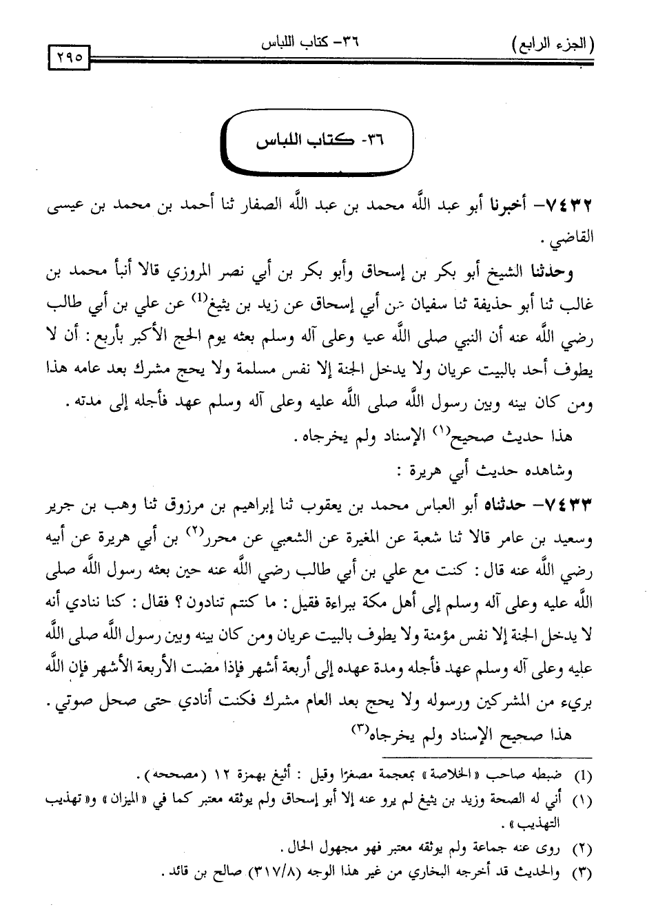 7433 - حَدَّثَنَاهُ أَبُو الْعَبَّاسِ مُحَمَّدُ بْنُ يَعْقُوبَ ، ثَنَا إِبْرَاهِيمُ بْنُ مَرْزُوقٍ ، ثَنَا وَهْبُ بْنُ جَرِيرٍ ، وَسَعِيدُ بْنُ عَامِرٍ ، قَالَا: ثَنَا شُعْبَةُ ، عَنِ الْمُغِيرَةِ ، عَنِ الشَّعْبِيِّ ، عَنْ مُحَرَّرِ بْنِ أَبِي هُرَيْرَةَ ، عَنْ أَبِيهِ ، رَضِيَ اللَّهُ عَنْهُ قَالَ: كُنْتُ مَعَ عَلِيِّ بْنِ أَبِي طَالِبٍ ، رَضِيَ اللَّهُ عَنْهُ حِينَ بَعَثَهُ رَسُولُ اللَّهِ صَلَّى اللَّهُ عَلَيْهِ وَسَلَّمَ إِلَى أَهْلِ مَكَّةَ بِبَرَاءَةَ فَقِيلَ: مَا كُنْتُمْ تُنَادُونَ ؟ فَقَالَ: " كُنَّا نُنَادِي أَنَّهُ لَا يَدْخُلُ الْجَنَّةَ إِلَّا نَفْسٌ مُؤْمِنَةٌ ، وَلَا يَطُوفُ بِالْبَيْتِ عُرْيَانٌ ، وَمَنْ كَانَ بَيْنَهُ وَبَيْنَ رَسُولِ اللَّهِ صَلَّى اللَّهُ عَلَيْهِ وَسَلَّمَ عَهْدٌ فَأَجَلُهُ وَمُدَّةُ عَهْدِهِ إِلَى أَرْبَعَةِ أَشْهُرٍ فَإِذَا مَضَتِ الْأَرْبَعَةُ الْأَشْهُرِ فَإِنَّ اللَّهَ بَرِيءٌ مِنَ الْمُشْرِكِينَ وَرَسُولَهُ ، وَلَا يَحُجُّ بَعْدَ الْعَامِ مُشْرِكٌ " فَكُنْتُ أُنَادِي حَتَّى صَحِلَ صَوْتِي