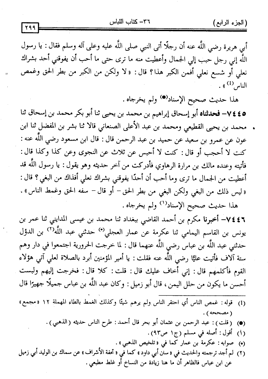 7445 - فَحَدَّثَنَاهُ أَبُو إِسْحَاقَ إِبْرَاهِيمُ بْنُ مُحَمَّدِ بْنِ يَحْيَى ، ثَنَا أَبُو بَكْرٍ مُحَمَّدُ بْنُ إِسْحَاقَ ، ثَنَا مُحَمَّدُ بْنُ يَحْيَى الْقَطِيعِيُّ * ، وَمُحَمَّدُ بْنُ عَبْدِ الْأَعْلَى الصَّنْعَانِيُّ ، قَالَا: ثَنَا بِشْرُ بْنُ الْمُفَضَّلِ ، ثَنَا ابْنُ عَوْنٍ ، عَنْ عَمْرِو بْنِ سَعِيدٍ ، عَنْ حُمَيْدِ بْنِ عَبْدِ الرَّحْمَنِ ، قَالَ: قَالَ ابْنُ مَسْعُودٍ ، رَضِيَ اللَّهُ عَنْهُ: كُنْتُ لَا أُحْجَبُ - أَوْ قَالَ: كُنْتُ لَا أُحْبَسُ - عَنْ ثَلَاثٍ: عَنِ النَّجْوَى وَعَنْ كَذَا وَكَذَا . قَالَ: فَأَتَيْتُهُ وَعِنْدَهُ مَالِكُ بْنُ مُرَارَةَ الرَّهَاوِيُّ فَأَدْرَكْتُ مِنْ آخِرِ حَدِيثِهِ وَهُوَ يَقُولُ: يَا رَسُولَ اللَّهِ قَدْ أُعْطِيتُ مِنَ الْجَمَالِ مَا تَرَى وَمَا أُحِبُّ أَنَّ أَحَدًا يَفُوقُنِي بِشِرَاكِ نَعْلِي أَفَذَاكَ مِنَ الْبَغْيِ ؟ قَالَ: " لَيْسَ ذَلِكَ مِنَ الْبَغْيِ ، وَلَكِنَّ الْبَغْيَ مَنْ بَطَرَ الْحَقَّ - أَوْ قَالَ: سَفَّهَ الْحَقَّ - وَغَمَطَ النَّاسَ "