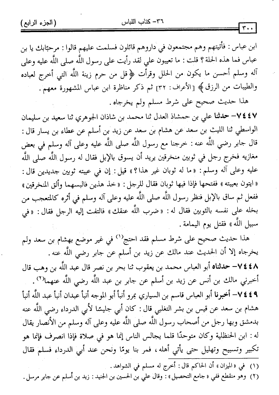 7447 - حَدَّثَنَا عَلِيُّ بْنُ حَمْشَاذَ الْعَدْلُ ، ثَنَا مُحَمَّدُ بْنُ شَاذَانَ الْجَوْهَرِيُّ ، ثَنَا سَعِيدُ بْنُ سُلَيْمَانَ الْوَاسِطِيُّ ، ثَنَا اللَّيْثُ بْنُ سَعْدٍ ، عَنْ هِشَامِ بْنِ سَعْدٍ ، عَنْ زَيْدِ بْنِ أَسْلَمَ ، عَنْ عَطَاءِ بْنِ يَسَارٍ ، قَالَ: قَالَ جَابِرٌ ، رَضِيَ اللَّهُ عَنْهُ: خَرَجْنَا مَعَ رَسُولِ اللَّهِ صَلَّى اللَّهُ عَلَيْهِ وَسَلَّمَ فِي بَعْضِ مَغَازِيهِ فَخَرَجَ رَجُلٌ فِي ثَوْبَيْنِ مُنْخَرِقَيْنِ يُرِيدُ أَنْ يَسُوقَ بِالْإِبِلِ فَقَالَ لَهُ رَسُولُ اللَّهِ صَلَّى اللَّهُ عَلَيْهِ وَسَلَّمَ: " مَا لَهُ ثَوْبَانِ غَيْرُ هَذَا ؟ " قِيلَ: إِنَّ فِي عَيْبَتِهِ ثَوْبَيْنِ جَدِيدَيْنِ . قَالَ: " إِيتُونِي بِعَيْبَتِهِ " فَفَتَحَهَا فَإِذَا فِيهَا ثَوْبَانِ فَقَالَ لِلرَّجُلِ: " خُذْ هَذَيْنِ فَالْبَسْهُمَا وَأَلْقِ الْمُنْخَرِقَيْنِ " فَفَعَلَ ثُمَّ سَاقَ بِالْإِبِلِ فَنَظَرَ رَسُولُ اللَّهِ صَلَّى اللَّهُ عَلَيْهِ وَسَلَّمَ فِي أَثَرِهِ كَالْمُتَعَجِّبِ مِنْ بُخْلِهِ عَلَى نَفْسِهِ بِالثَّوْبَيْنِ فَقَالَ لَهُ: " ضَرَبَ اللَّهُ عُنُقَكَ " فَالْتَفَتَ إِلَيْهِ الرَّجُلُ فَقَالَ: فِي سَبِيلِ اللَّهِ ، فَقُتِلَ يَوْمِ الْيَمَامَةِ