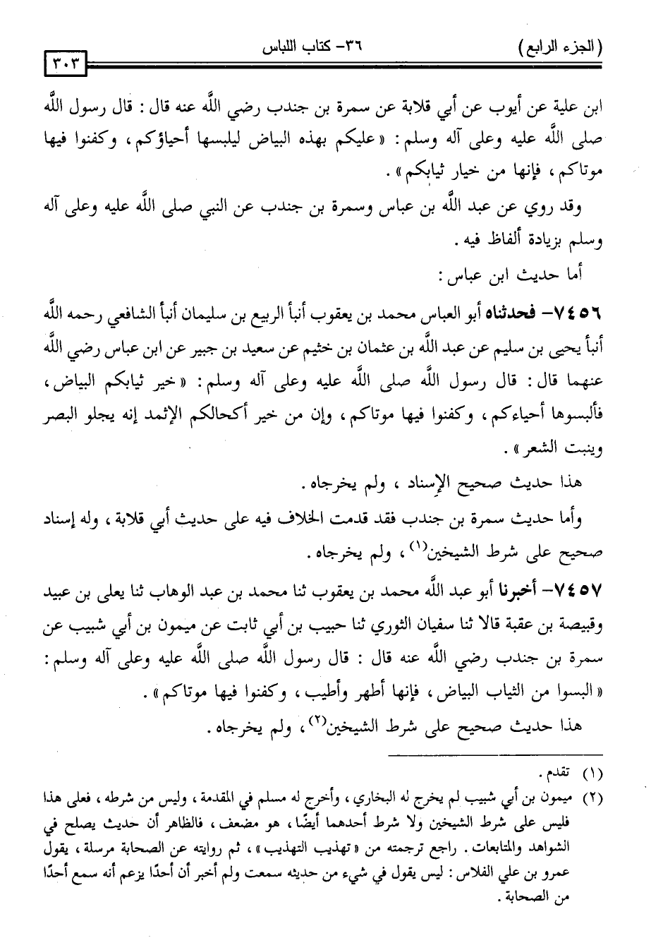 7457 - أَخْبَرَنَا أَبُو عَبْدِ اللَّهِ مُحَمَّدُ بْنُ يَعْقُوبَ ، ثَنَا مُحَمَّدُ بْنُ عَبْدِ الْوَهَّابِ ، ثَنَا يَعْلَى بْنُ عُبَيْدٍ ، وَقَبِيصَةُ بْنُ عُقْبَةَ ، قَالَا: ثَنَا سُفْيَانُ الثَّوْرِيُّ ، ثَنَا حَبِيبُ بْنُ أَبِي ثَابِتٍ ، عَنْ مَيْمُونِ بْنِ أَبِي شَبِيبٍ ، عَنْ سَمُرَةَ بْنِ جُنْدُبٍ ، رَضِيَ اللَّهُ عَنْهُ قَالَ: قَالَ رَسُولُ اللَّهِ صَلَّى اللَّهُ عَلَيْهِ وَسَلَّمَ: " الْبَسُوا مِنَ الثِّيَابِ الْبَيَاضَ فَإِنَّهَا أَطْهَرُ وَأَطْيَبُ وَكَفِّنُوا فِيهَا مَوْتَاكُمْ "