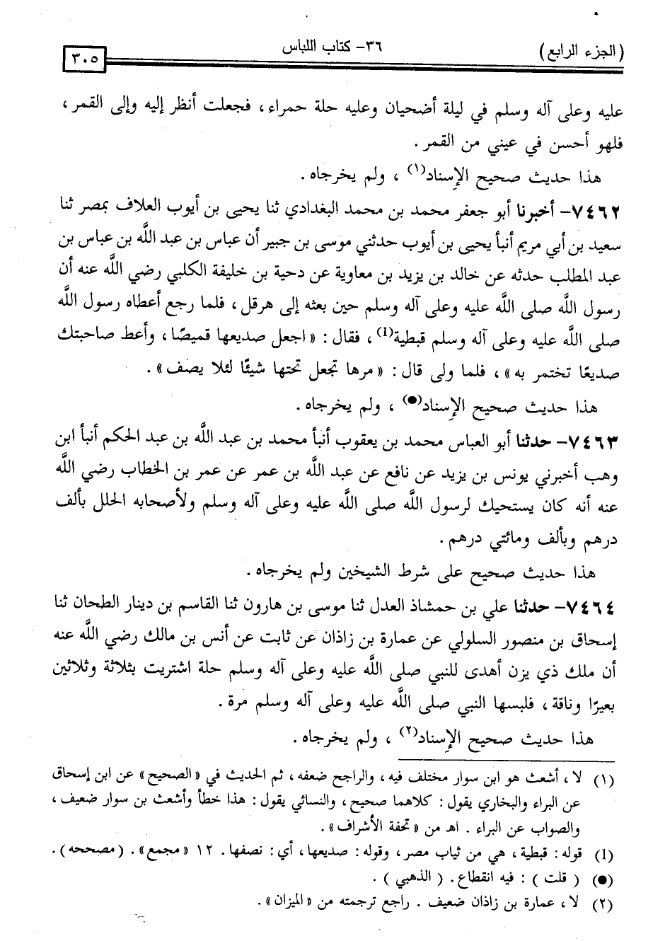 7464 - حَدَّثَنَا عَلِيُّ بْنُ حَمْشَاذَ الْعَدْلُ ، ثَنَا مُوسَى بْنُ هَارُونَ ، ثَنَا الْقَاسِمُ بْنُ دِينَارٍ الطَّحَّانُ ، ثَنَا إِسْحَاقُ بْنُ مَنْصُورٍ السَّلُولِيُّ ، عَنْ عُمَارَةَ بْنِ زَاذَانَ ، عَنْ ثَابِتٍ ، عَنْ أَنَسِ بْنِ مَالِكٍ رَضِيَ اللَّهُ عَنْهُ " أَنَّ مَلِكَ ذِي يَزِنَ أَهْدَى لِلنَّبِيِّ صَلَّى اللَّهُ عَلَيْهِ وَسَلَّمَ حُلَّةً اشْتُرِيَتْ بِثَلَاثَةٍ وَثَلَاثِينَ بَعِيرًا وَنَاقَةٍ فَلَبِسَهَا النَّبِيُّ صَلَّى اللَّهُ عَلَيْهِ وَسَلَّمَ مَرَّةً "