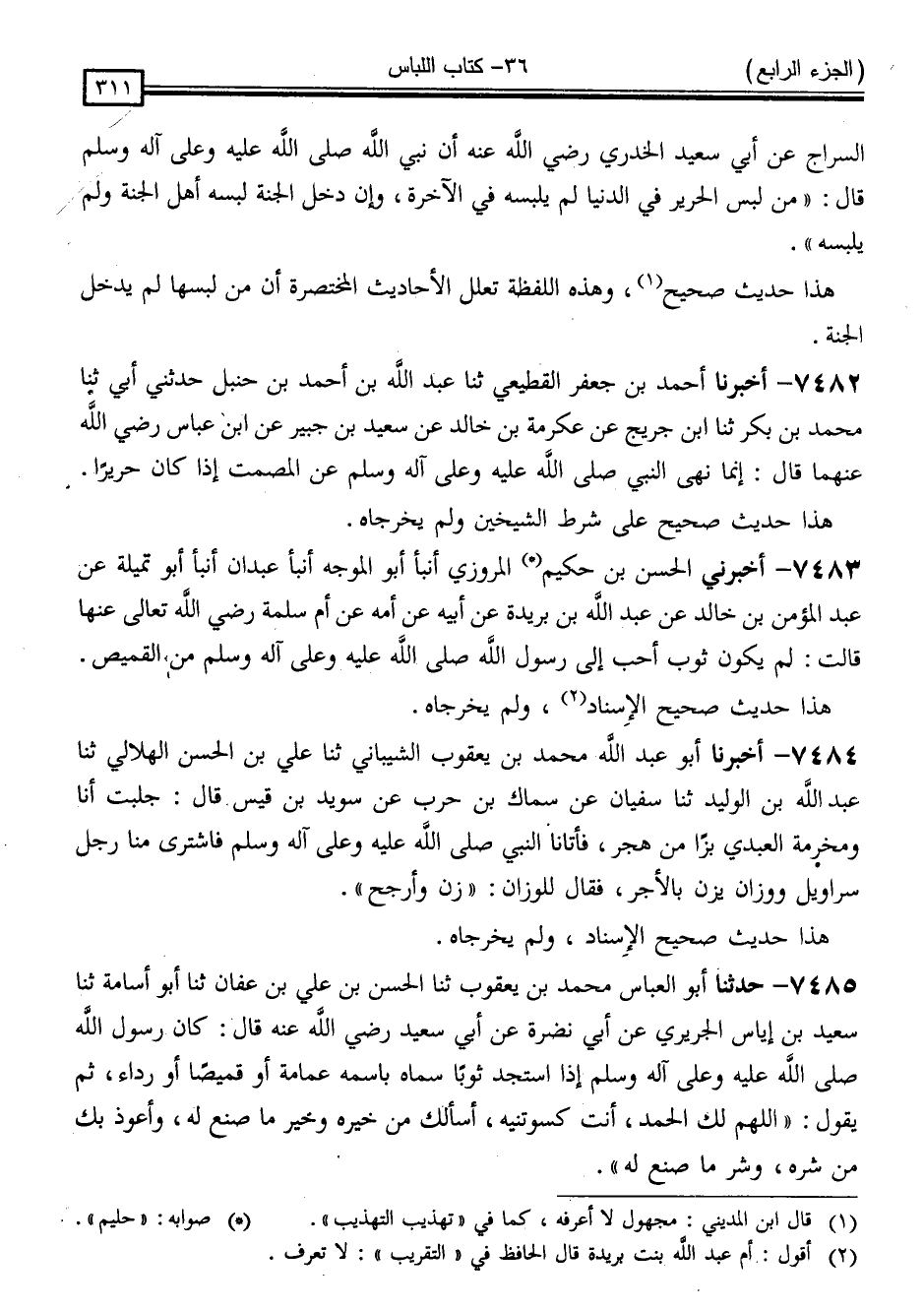 7485 - حَدَّثَنَا أَبُو الْعَبَّاسِ مُحَمَّدُ بْنُ يَعْقُوبَ ، ثَنَا الْحَسَنُ بْنُ عَلِيِّ بْنِ عَفَّانَ ، ثَنَا أَبُو أُسَامَةَ ، ثَنَا سَعِيدُ بْنُ إِيَاسٍ الْجُرَيْرِيُّ ، عَنْ أَبِي نَضْرَةَ ، عَنْ أَبِي سَعِيدٍ رَضِيَ اللَّهُ عَنْهُ قَالَ: كَانَ رَسُولُ اللَّهِ صَلَّى اللَّهُ عَلَيْهِ وَسَلَّمَ إِذَا اسْتَجَدَّ ثَوْبًا سَمَّاهُ عِمَامَةً أَوْ قَمِيصًا أَوْ رِدَاءً ثُمَّ يَقُولُ: " اللَّهُمَّ لَكَ الْحَمْدُ أَنْتَ كَسَوْتَنِيهِ أَسْأَلُكَ مِنْ خَيْرِهِ وَخَيْرِ مَا صُنِعَ لَهُ وَأَعُوذُ بِكَ مِنْ شَرِّهِ وَشَرِّ مَا صُنِعَ لَهُ " -[312]-