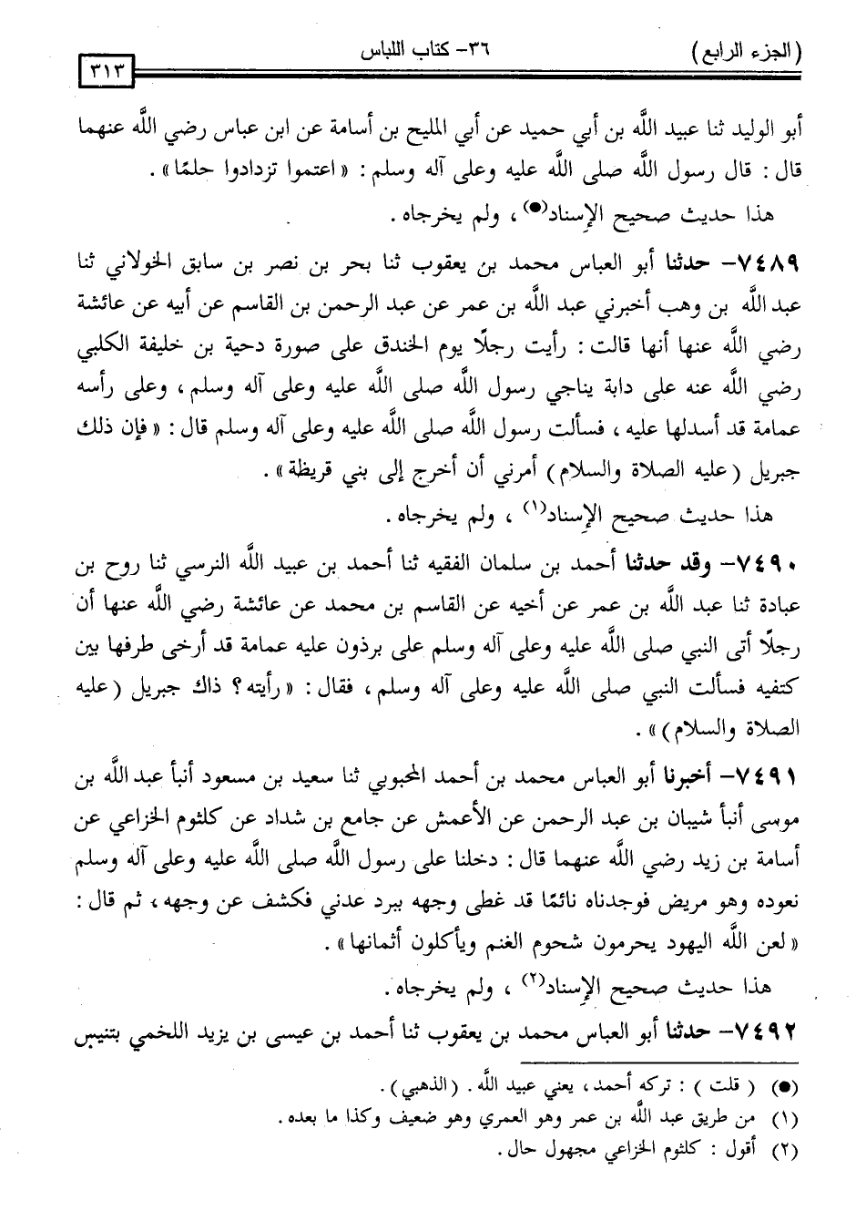 7491 - أَخْبَرَنَا أَبُو الْعَبَّاسِ مُحَمَّدُ بْنُ أَحْمَدَ الْمَحْبُوبِيُّ ، ثَنَا سَعِيدُ بْنُ مَسْعُودٍ ، أَنْبَأَ عُبَيْدُ اللَّهِ بْنُ مُوسَى ، أَنْبَأَ شَيْبَانُ بْنُ عَبْدِ الرَّحْمَنِ ، عَنِ الْأَعْمَشِ ، عَنْ جَامِعِ بْنِ شَدَّادٍ ، عَنْ كُلْثُومٍ الْخُزَاعِيِّ ، عَنْ أُسَامَةَ بْنِ زَيْدٍ رَضِيَ اللَّهُ عَنْهُمَا قَالَ: دَخَلْنَا عَلَى رَسُولِ اللَّهِ صَلَّى اللَّهُ عَلَيْهِ وَسَلَّمَ نَعُودُهُ وَهُوَ مَرِيضٌ فَوَجَدْنَاهُ نَائِمًا قَدْ غَطَّى وَجْهَهُ بِبُرْدٍ عَدَنِيٍّ فَكَشَفَ عَنْ وَجْهِهِ ثُمَّ قَالَ: " لَعَنَ اللَّهُ الْيَهُودَ يُحَرِّمُونَ شُحُومَ الْغَنَمِ وَيَأْكُلُونَ أَثْمَانَهَا "
