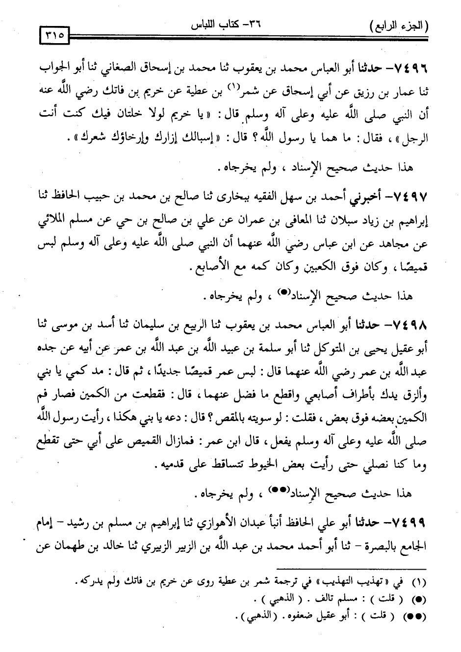 7497 - أَخْبَرَنِي أَحْمَدُ بْنُ سَهْلٍ الْفَقِيهُ بِبُخَارَى ، ثَنَا صَالِحُ بْنُ مُحَمَّدِ بْنِ حَبِيبٍ الْحَافِظُ ، ثَنَا إِبْرَاهِيمُ بْنُ زِيَادٍ سَبَلَانُ ، ثَنَا الْمُعَافَى بْنُ عِمْرَانَ ، عَنْ عَلِيِّ بْنِ صَالِحِ بْنِ حَيٍّ ، عَنْ مُسْلِمٍ الْمُلَائِيِّ ، عَنْ مُجَاهِدٍ ، عَنِ ابْنِ عَبَّاسٍ ، رَضِيَ اللَّهُ عَنْهُمَا " أَنَّ النَّبِيَّ صَلَّى اللَّهُ عَلَيْهِ وَسَلَّمَ لَبِسَ قَمِيصًا وَكَانَ فَوْقَ الْكَعْبَيْنِ وَكَانَ كُمُّهُ مَعَ الْأَصَابِعِ "