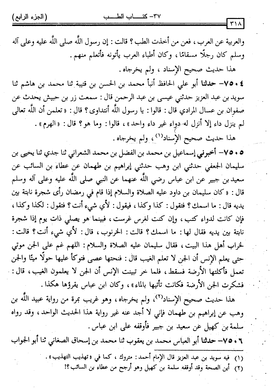 7506 - حَدَّثَنَا أَبُو الْعَبَّاسِ مُحَمَّدُ بْنُ يَعْقُوبَ ، ثَنَا مُحَمَّدُ بْنُ إِسْحَاقَ الصَّغَانِيُّ ، ثَنَا أَبُو الْجَوَّابِ ، -[319]- ثَنَا عَبْدُ الْجَبَّارِ بْنُ الْعَبَّاسِ الشَّيْبَانِيُّ ، عَنْ سَلَمَةَ بْنِ كُهَيْلٍ ، عَنْ سَعِيدِ بْنِ جُبَيْرٍ ، عَنِ ابْنِ عَبَّاسٍ ، رَضِيَ اللَّهُ عَنْهُمَا قَالَ: " كَانَ سُلَيْمَانُ بْنُ دَاوُدَ عَلَيْهِمَا الصَّلَاةُ وَالسَّلَامُ إِذَا صَلَّى الصَّلَاةَ طَلَعَتْ بَيْنَ عَيْنَيْهِ شَجَرَةٌ فَيَقُولُ لَهَا: مَا أَنْتِ وَلِأَيِّ شَيْءٍ طَلَعْتِ ؟ فَتَقُولُ: أَنَا شَجَرَةُ كَذَا وَكَذَا طَلَعْتُ لِدَاءِ كَذَا وَكَذَا ، فَلَمَّا صَلَّى ذَاتَ يَوْمٍ الْغَدَاةَ طَلَعَتْ بَيْنَ عَيْنَيْهِ شَجَرَةٌ فَقَالَ لَهَا: مَا أَنْتِ وَلِأَيِّ شَيْءٍ طَلَعْتِ ؟ قَالَتْ: أَنَا الْخَرْنُوبُ طَلَعْتُ لِخَرَابِ هَذَا الْمَسْجِدِ ، فَعَلِمَ سُلَيْمَانُ عَلَيْهِ الصَّلَاةُ وَالسَّلَامُ أَنَّ أَجَلَهُ قَدِ اقْتَرَبَ وَأَنَّ بَيْتَ الْمَقْدِسِ لَا يُخَرَّبُ وَهُوَ حَيٌّ فَدَعَا اللَّهَ تَعَالَى أَنْ يُغْمِيَ عَلَى الشَّيْطَانِ مَوْتَهُ ، وَكَانَتِ الْجِنُّ تَزْعُمُ أَنَّ الشَّيَاطِينَ يَعْلَمُونَ الْغَيْبَ فَمَاتَ عَلَى عَصَاهُ فَأَكَلَتْهَا الْأَرَضَةُ فَسَقَطَ فَحَقَّ عَلَى الشَّيَاطِينِ أَنْ تَأْتِيَ الْأَرَضَةَ بِالْمَاءِ حَيْثُ كَانَتْ تُثْنِي عَلَيْهَا شُكْرًا بِمَا صَنَعَتْ بِعَصَا سُلَيْمَانَ "