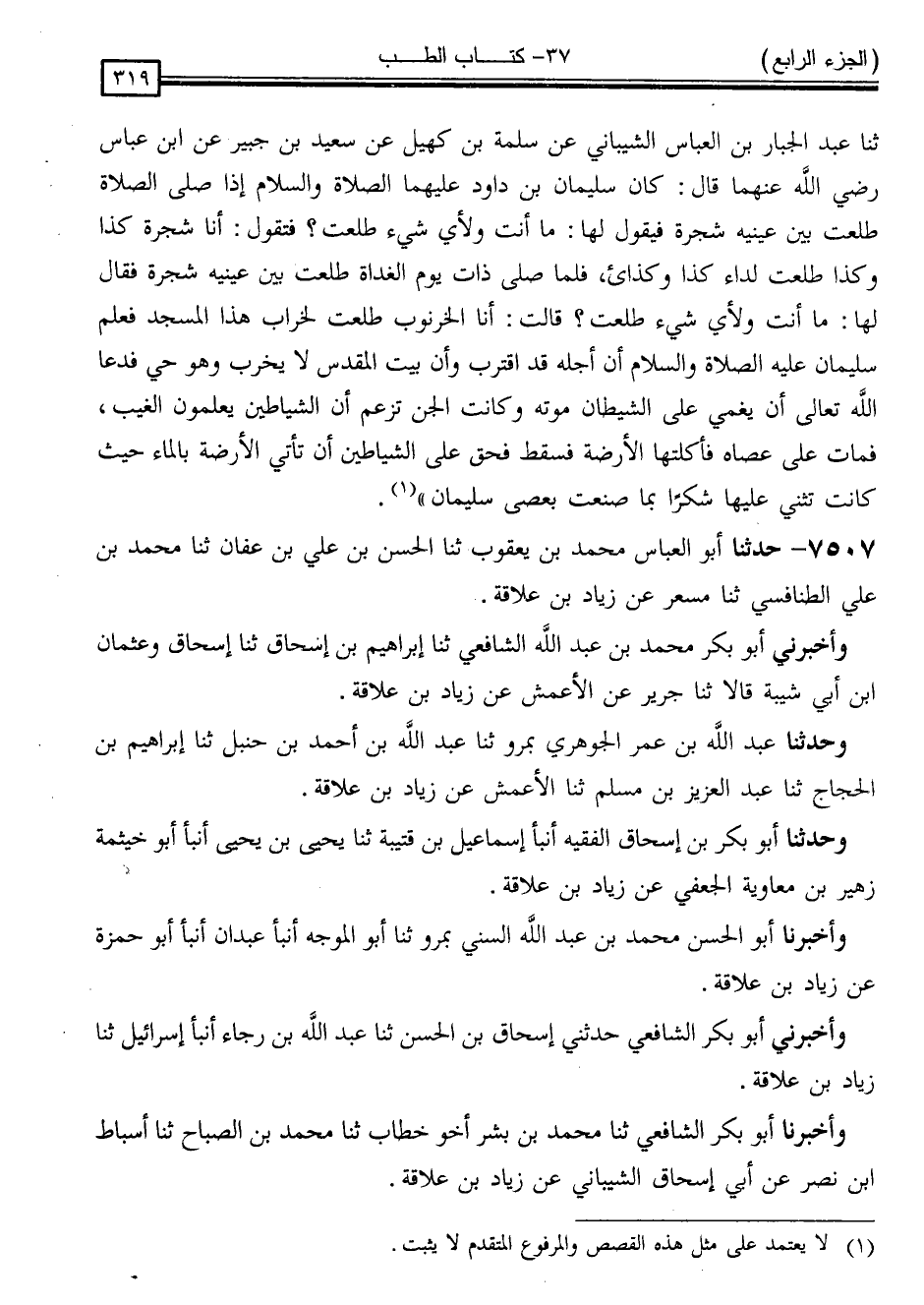 وَأَخْبَرَنَا أَبُو بَكْرٍ الشَّافِعِيُّ ، ثَنَا مُحَمَّدُ بْنُ بِشْرٍ ، أَخُو خَطَّابٍ ، ثَنَا مُحَمَّدُ بْنُ الصَّبَّاحِ ، ثَنَا أَسْبَاطُ بْنُ نَصْرٍ ، عَنْ أَبِي إِسْحَاقَ الشَّيْبَانِيِّ ، عَنْ زِيَادِ بْنِ عِلَاقَةَ ، -[320]- وَأَخْبَرَنَا أَحْمَدُ بْنُ جَعْفَرٍ الْقَطِيعِيُّ ، ثَنَا عَبْدُ اللَّهِ بْنُ أَحْمَدَ بْنِ حَنْبَلٍ ، حَدَّثَنِي أَبِي ، ثَنَا الْمُطَّلِبُ بْنُ زِيَادٍ ، ثَنَا زِيَادُ بْنُ عِلَاقَةَ ، وَأَخْبَرَنَا أَحْمَدُ بْنُ عُثْمَانَ الْآدَمِيُّ ، بِبَغْدَادَ ، ثَنَا مُحَمَّدُ بْنُ مَسْلَمَةَ الْوَاسِطِيُّ ، ثَنَا يَزِيدُ بْنُ هَارُونَ ، أَنْبَأَ الْمَسْعُودِيُّ ، عَنْ زِيَادِ بْنِ عِلَاقَةَ ، وَحَدَّثَنَا أَبُو بَكْرِ بْنُ إِسْحَاقَ الْفَقِيهُ ، وَعَلِيُّ بْنُ حَمْشَاذَ الْعَدْلُ ، وَأَبُو بَكْرٍ الشَّافِعِيُّ ، قَالُوا: وَاللَّفْظُ لَهُمْ ثَنَا بِشْرُ بْنُ مُوسَى ، ثَنَا الْحُمَيْدِيُّ ، ثَنَا سُفْيَانُ ، حَدَّثَنِي زِيَادُ بْنُ عِلَاقَةَ ، قَالَ: سَمِعْتُ أُسَامَةَ بْنَ شَرِيكٍ الْعَامِرِيَّ ، يَقُولُ: شَهِدْتُ الْأَعَارِيبَ يَسْأَلُونَ رَسُولَ اللَّهِ صَلَّى اللَّهُ عَلَيْهِ وَسَلَّمَ هَلْ عَلَيْنَا حَرَجٌ فِي كَذَا وَكَذَا فَقَالَ: " عِبَادَ اللَّهِ وَضَعَ اللَّهُ الْحَرَجَ إِلَّا مَنِ اقْتَرَضَ مِنْ عِرْضِ أَخِيهِ شَيْئًا فَذَلِكَ الَّذِي حَرَجٌ وَهَلَكٌ "