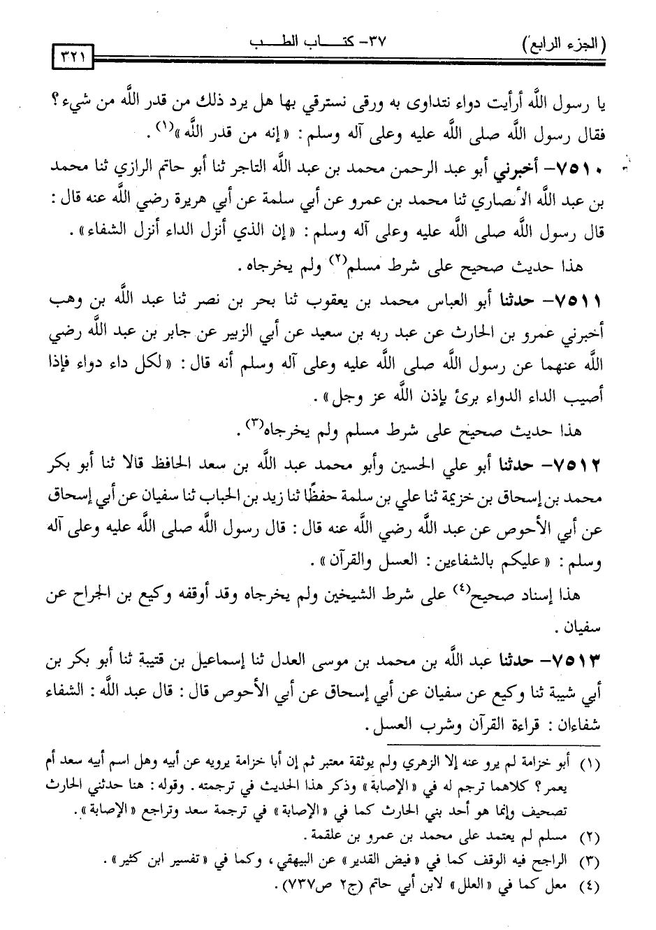 7512 - حَدَّثَنَا أَبُو عَلِيٍّ الْحُسَيْنُ ، وَأَبُو مُحَمَّدٍ عَبْدُ اللَّهِ بْنُ سَعْدٍ الْحَافِظُ ، قَالَا: ثَنَا أَبُو بَكْرٍ مُحَمَّدُ بْنُ إِسْحَاقَ بْنِ خُزَيْمَةَ ، ثَنَا عَلِيُّ بْنُ سَلَمَةَ ، حِفْظًا ، ثَنَا زَيْدُ بْنُ الْحُبَابِ ، ثَنَا سُفْيَانُ ، عَنْ أَبِي إِسْحَاقَ ، عَنْ أَبِي الْأَحْوَصِ ، عَنْ عَبْدِ اللَّهِ ، رَضِيَ اللَّهُ عَنْهُ قَالَ: قَالَ رَسُولُ اللَّهِ صَلَّى اللَّهُ عَلَيْهِ وَسَلَّمَ: " عَلَيْكُمْ بِالشِّفَائَيْنِ: الْعَسَلُ وَالْقُرْآنُ "